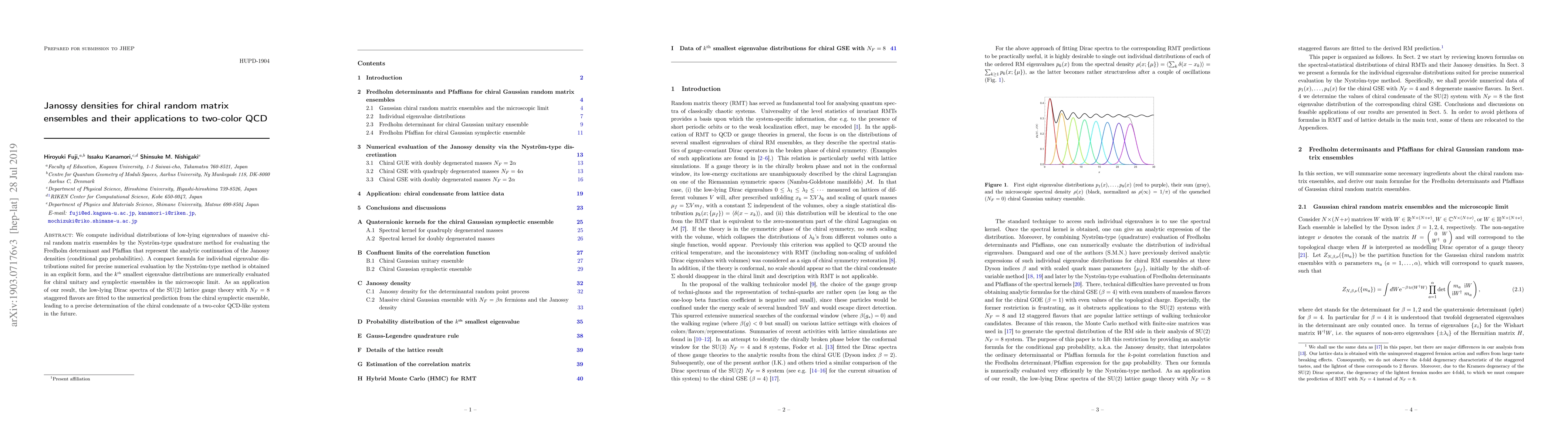 We compute individual distributions of low-lying eigenvalues of massive chiral random matrix ensembles by the Nystr\"om-type quadrature method for evaluating the Fredholm determinant and Pfaffian that represent the analytic continuation of the Janossy densities (conditional gap probabilities). A compact formula for individual eigenvalue distributions suited for precise numerical evaluation by the Nystr\"om-type method is obtained in an explicit form, and the $k^{\rm{\small th}}$ smallest eigenvalue distributions are numerically evaluated for chiral unitary and symplectic ensembles in the microscopic limit. As an application of our result, the low-lying Dirac spectra of the SU(2) lattice gauge theory with $N_F=8$ staggered flavors are fitted to the numerical prediction from the chiral symplectic ensemble, leading to a precise determination of the chiral condensateof a two-color QCD-like system in the future.