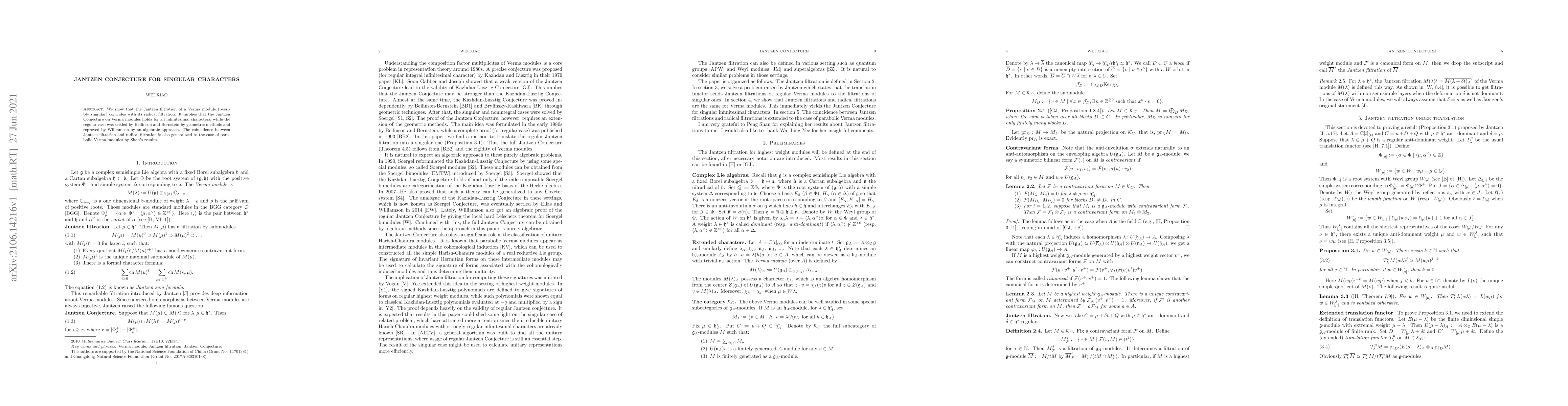 Summary: The Jantzen Conjecture is verified for singular characters by showing the equivalence of the Jantzen filtration and the radical filtration in Verma modules, extending the results from regular characters established by Beilinson-Bernstein and Williamson. Shan's work further generalizes this equivalence to parabolic Verma modules.