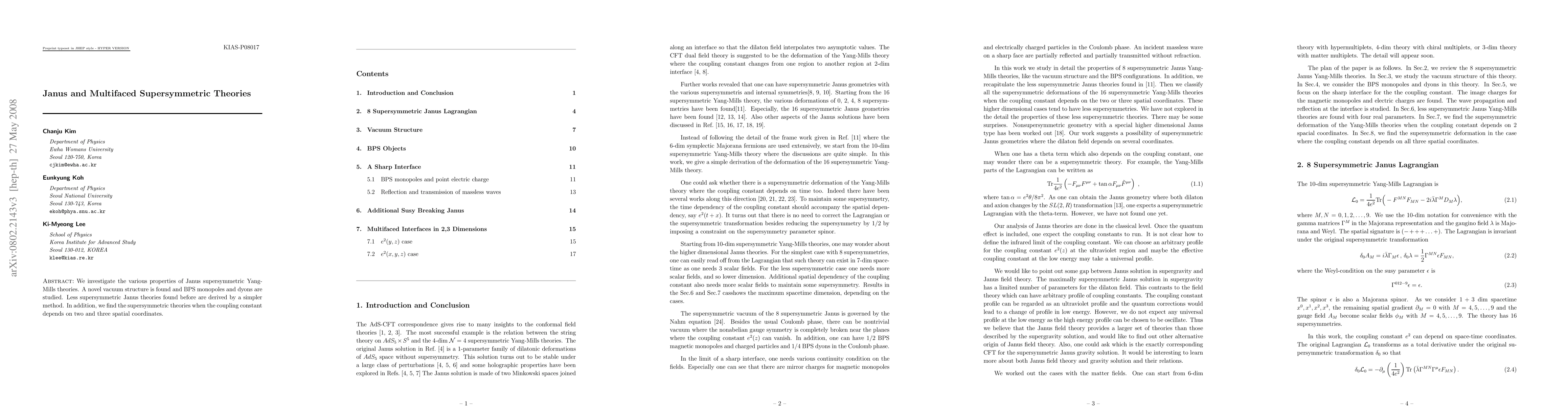 We investigate the various properties Janus supersymmetric Yang-Mills theories. A novel vacuum structure is found and BPS monopoles and dyons are studied. Less supersymmetric Janus theories found before are derived by a simpler method. In addition, we find the supersymmetric theories when the coupling constant depends on two and three spatial coordinates.