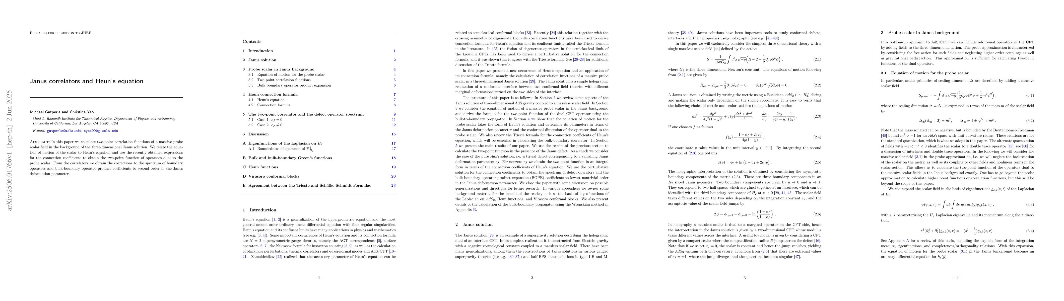 In this paper we calculate two-point correlation functions of a massive probe scalar field in the background of the three-dimensional Janus solution. We relate the equation of motion of the scalar to Heun's equation and use the recently obtained expressions for the connection coefficients to obtain the two-point function of operators dual to the probe scalar. From the correlators we obtain the corrections to the spectrum of boundary operators and bulk-boundary operator product coefficients to second order in the Janus deformation parameter.