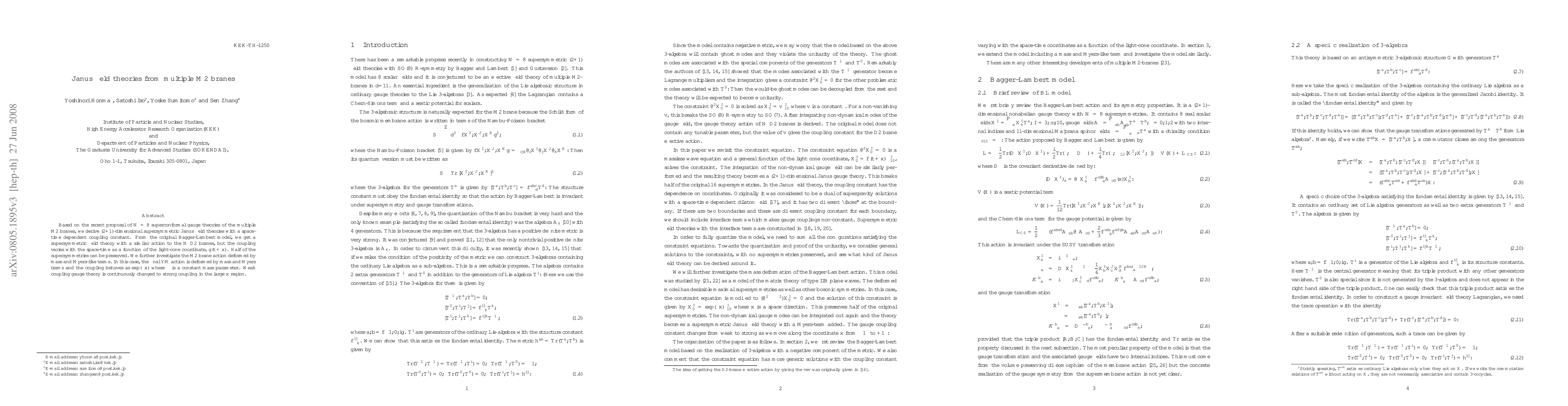 This paper derives (2+1)-dimensional Janus field theories from multiple M2 branes, featuring a space-time dependent coupling. The study extends the Bagger-Lambert model, preserving half of the supersymmetries and exploring deformations by mass and Myers-like terms, which transform weak coupling gauge theory to strong coupling.