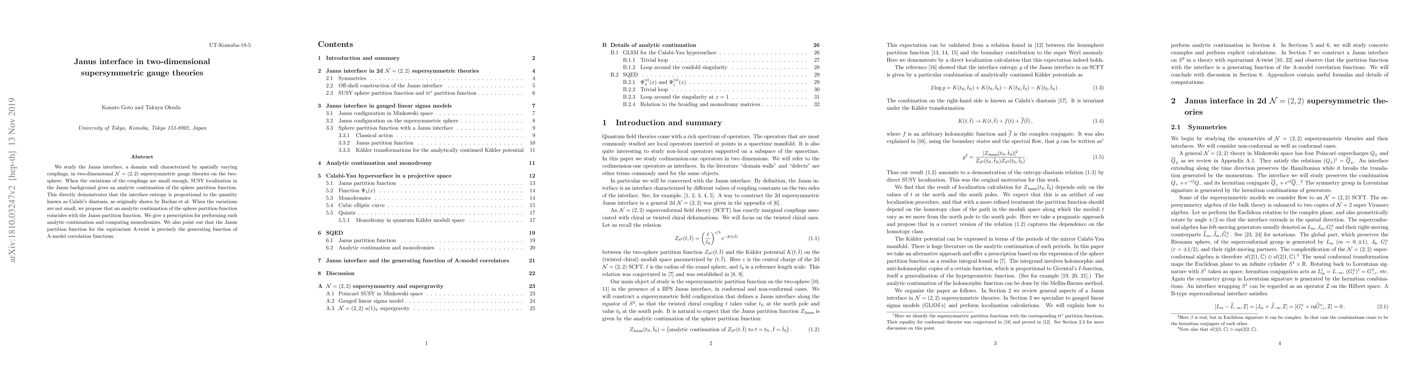 We study the Janus interface, a domain wall characterized by spatially varying couplings, in two-dimensional N=(2,2) supersymmetric gauge theories on the two-sphere. When the variations of the couplings are small enough, SUSY localization in the Janus background gives an analytic continuation of the sphere partition function. This directly demonstrates that the interface entropy is proportional to the quantity known as Calabi's diastasis, as originally shown by Bachas et al. When the variations are not small, we propose that an analytic continuation of the sphere partition function coincides with the Janus partition function. We give a prescription for performing such analytic continuation and computing monodromies. We also point out that the Janus partition function for the equivariant A-twist is precisely the generating function of A-model correlation functions.