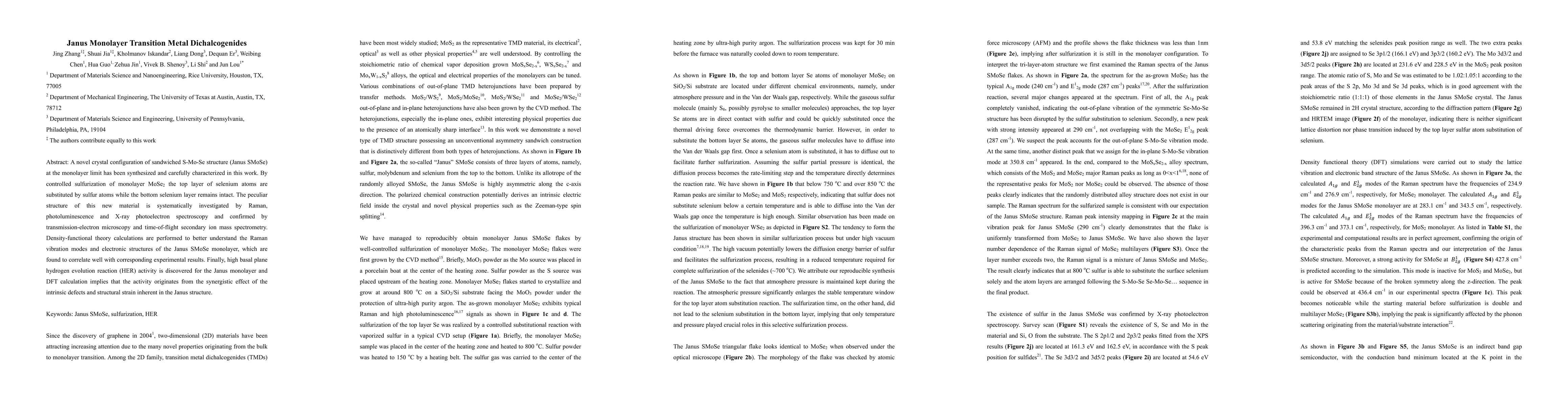 This study synthesizes and characterizes a novel Janus monolayer structure, S-Mo-Se (SMoSe), where sulfur replaces selenium in the top layer of a monolayer MoSe2. Experiments and density-functional theory calculations reveal its unique electronic structure and high hydrogen evolution reaction activity, attributed to intrinsic defects and structural strain.