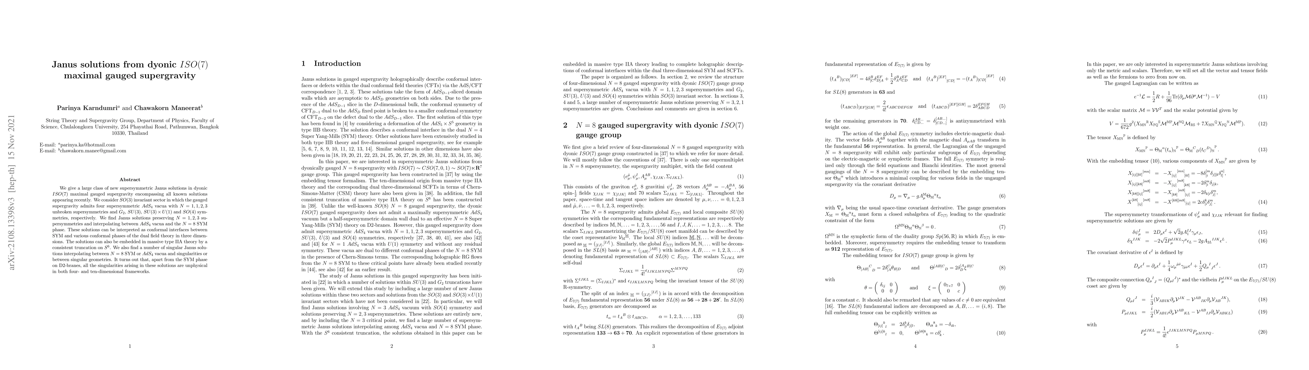 We give a large class of new supersymmetric Janus solutions in dyonic $ISO(7)$ maximal gauged supergravity encompassing all known solutions appearing recently. We consider $SO(3)$ invariant sector in which the gauged supergravity admits four supersymmetric $AdS_4$ vacua with $N=1,1,2,3$ unbroken supersymmetries and $G_2$, $SU(3)$, $SU(3)\times U(1)$ and $SO(4)$ symmetries, respectively. We find Janus solutions preserving $N=1,2,3$ supersymmetries and interpolating between $AdS_4$ vacua and the $N=8$ SYM phase. These solutions can be interpreted as conformal interfaces between SYM and various conformal phases of the dual field theory in three dimensions. The solutions can also be embedded in massive type IIA theory by a consistent truncation on $S^6$. We also find a number of singular Janus solutions interpolating between $N=8$ SYM or $AdS_4$ vacua and singularities or between singular geometries. It turns out that, apart from the SYM phase on D2-branes, all the singularities arising in these solutions are unphysical in both four- and ten-dimensional frameworks.