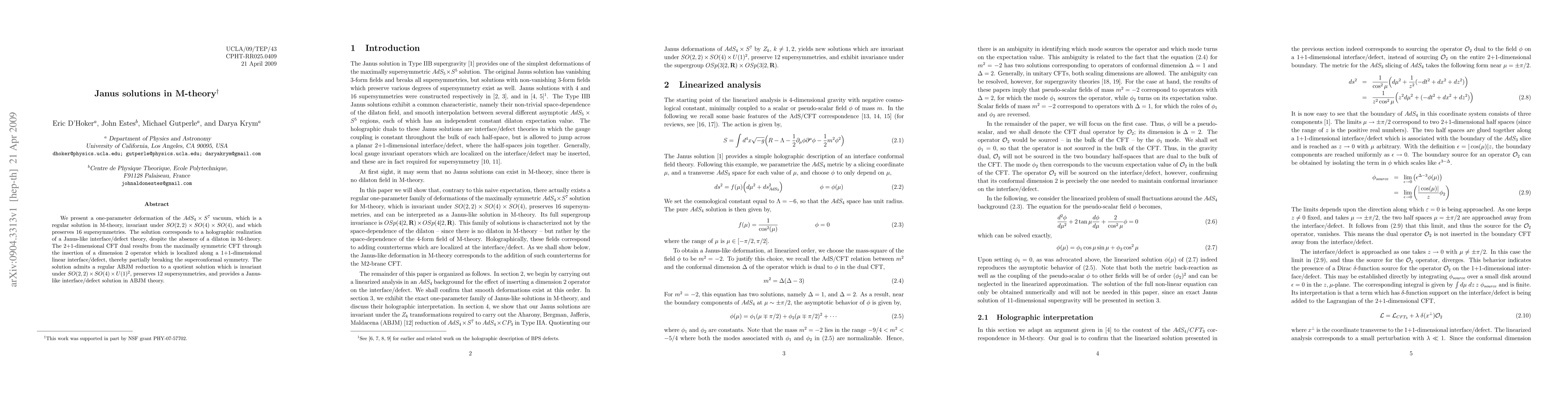 This paper introduces a one-parameter deformation of the AdS_{4} x S^{7} vacuum in M-theory, preserving 16 supersymmetries and realizing a Janus-like interface/defect theory. The study also explores its reduction to a quotient solution in ABJM theory, preserving 12 supersymmetries and maintaining the Janus-like interface/defect structure.