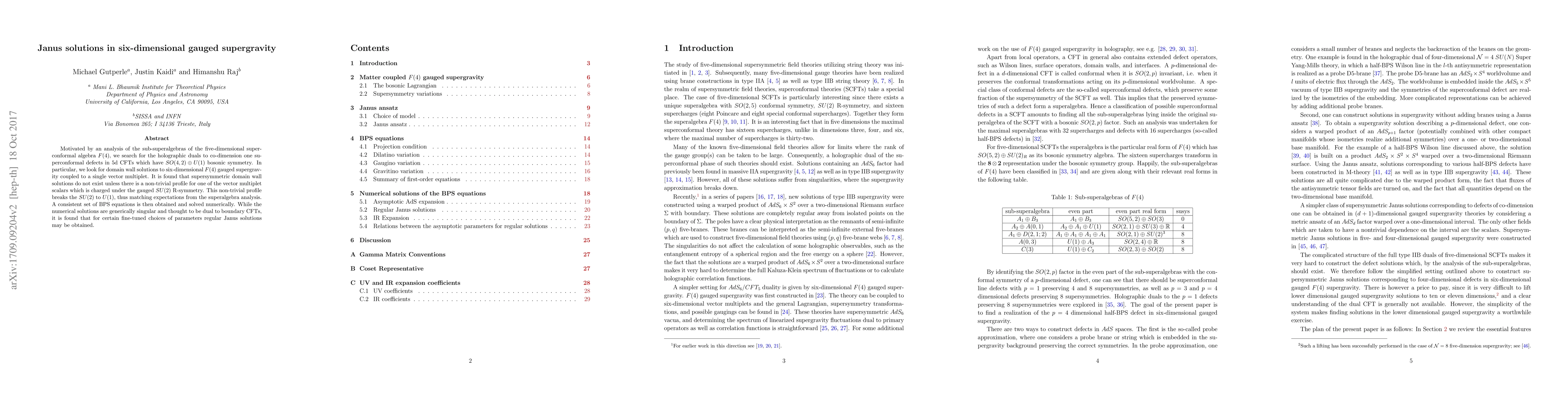 Motivated by an analysis of the sub-superalgebras of the five-dimensional superconformal algebra $F(4)$, we search for the holographic duals to co-dimension one superconformal defects in 5d CFTs which have $SO(4,2) \oplus U(1)$ bosonic symmetry. In particular, we look for domain wall solutions to six-dimensional $F(4)$ gauged supergravity coupled to a single vector multiplet. It is found that supersymmetric domain wall solutions do not exist unless there is a non-trivial profile for one of the vector multiplet scalars which is charged under the gauged $SU(2)$ R-symmetry. This non-trivial profile breaks the $SU(2)$ to $U(1)$, thus matching expectations from the superalgebra analysis. A consistent set of BPS equations is then obtained and solved numerically. While the numerical solutions are generically singular and thought to be dual to boundary CFTs, it is found that for certain fine-tuned choices of parameters regular Janus solutions may be obtained.