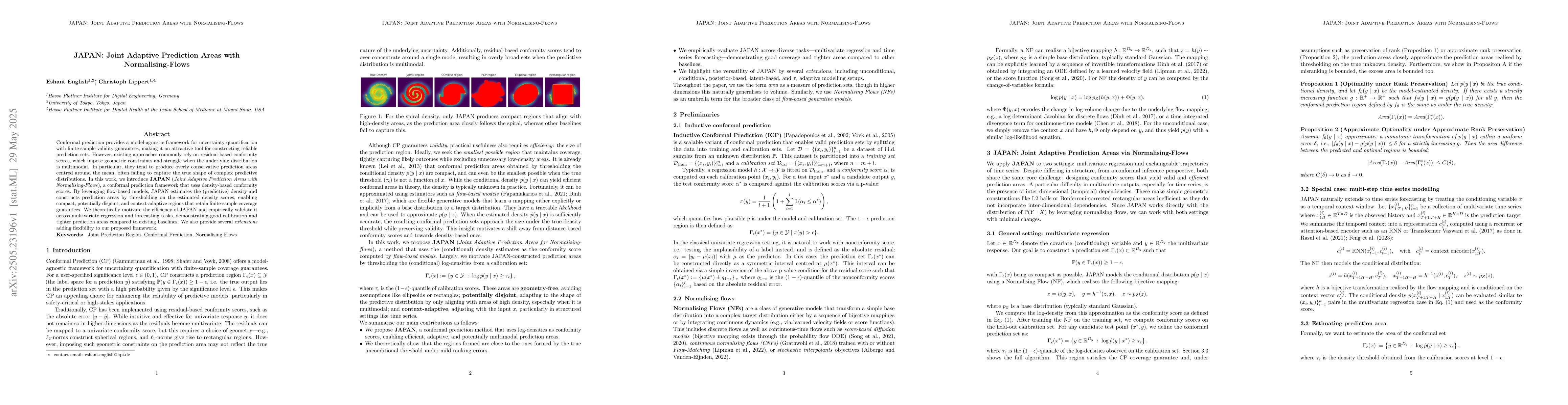 The research introduces JAPAN, a conformal prediction framework that employs density-based conformity scores using flow-based models to estimate predictive densities and construct adaptive prediction areas, ensuring finite-sample coverage guarantees.