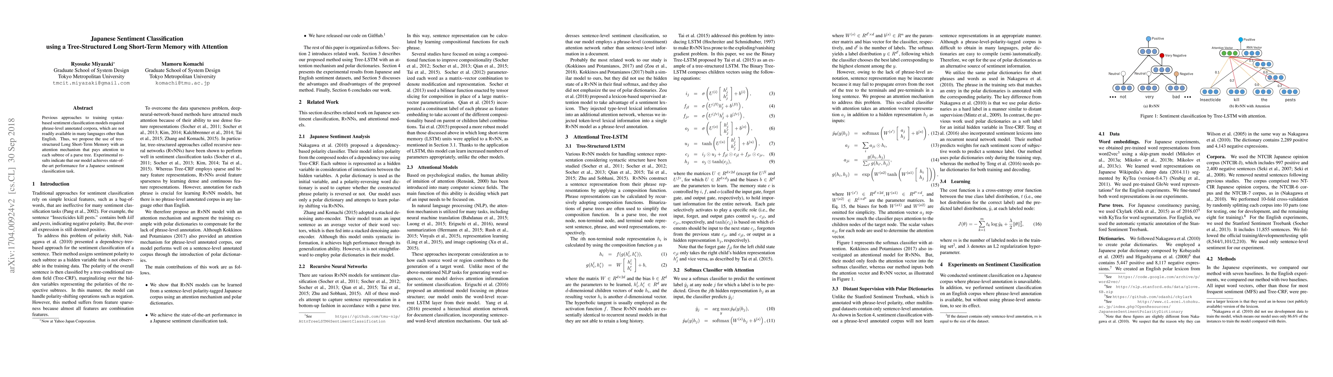 This paper proposes a tree-structured Long Short-Term Memory (LSTM) model with attention for Japanese sentiment classification, eliminating the need for phrase-level annotated corpora. The model achieves state-of-the-art performance in sentiment analysis for Japanese.