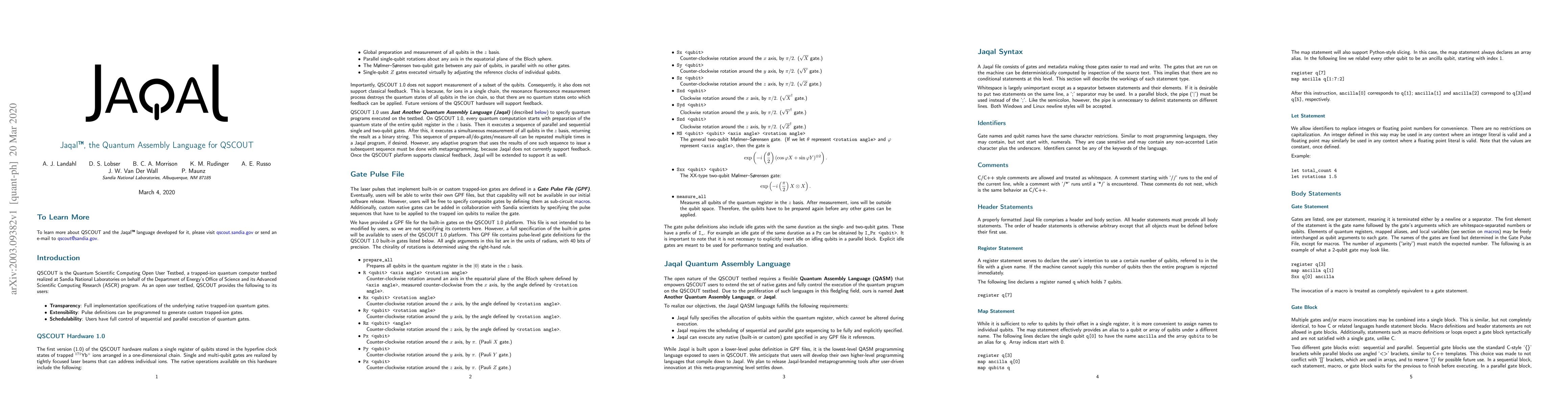 QSCOUT is the Quantum Scientific Computing Open User Testbed, a trapped-ion quantum computer testbed realized at Sandia National Laboratories on behalf of the Department of Energy's Office of Science and its Advanced Scientific Computing (ASCR) program. Jaqal, for Just Another Quantum Assembly Language, is the programming language used to specify programs executed on QSCOUT. This document contains a specification of Jaqal along with a summary of QSCOUT 1.0 capabilities, example Jaqal programs, and plans for possible future extensions. To learn more about QSCOUT and the Jaqal language developed for it, please visit qscout.sandia.gov or send an e-mail to [email protected].