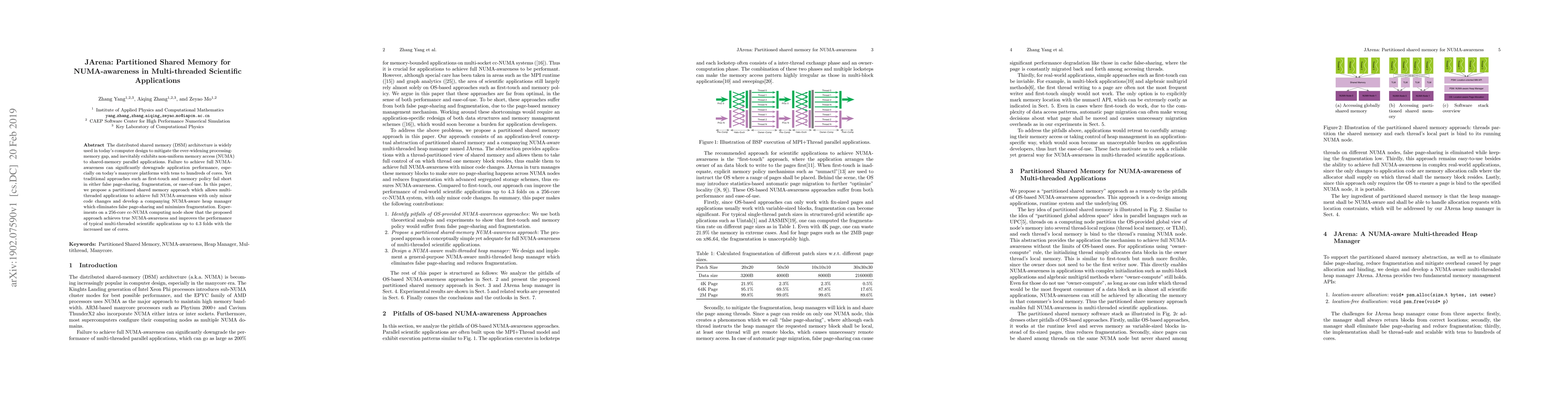 The paper proposes JArena, a partitioned shared memory approach to achieve full NUMA-awareness in multi-threaded scientific applications with minimal code changes. The accompanying NUMA-aware heap manager eliminates false page-sharing and minimizes fragmentation, resulting in up to 4.3-fold performance improvements on a 256-core computing node.
