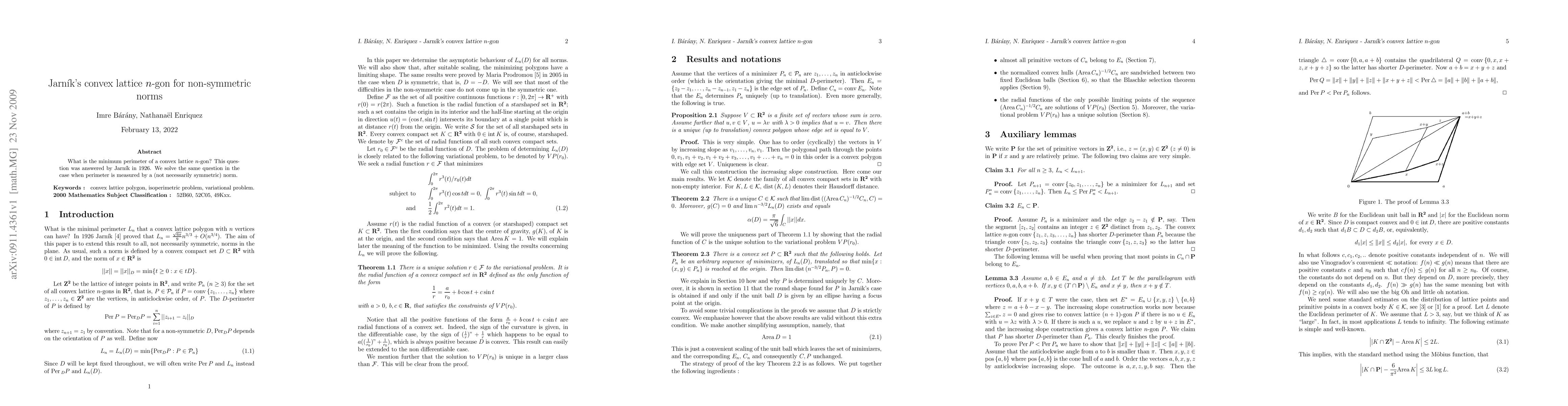This paper solves the minimum perimeter of a convex lattice n-gon for non-symmetric norms, answering a question first posed by Jarnik in 1926.