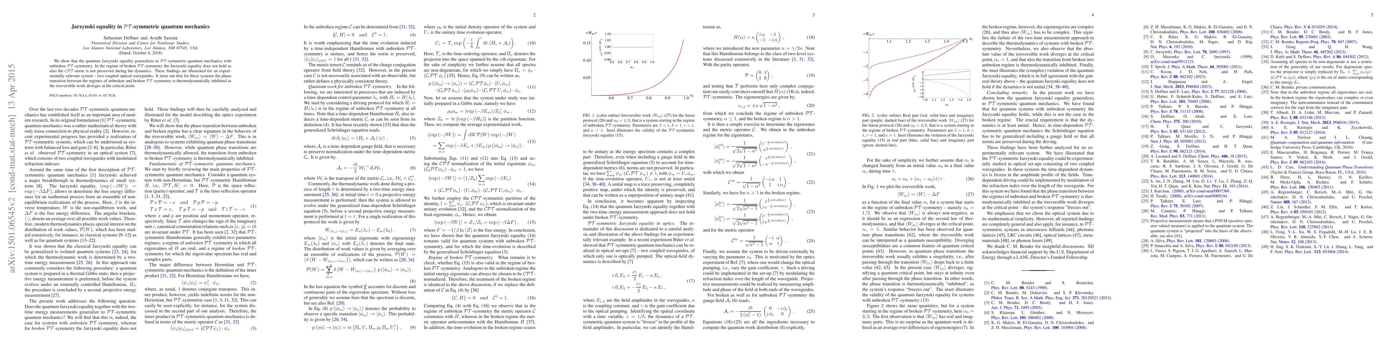 The paper demonstrates that the quantum Jarzynski equality holds in $\mathcal{PT}$-symmetric quantum mechanics with unbroken $\mathcal{PT}$-symmetry but fails in the regime of broken $\mathcal{PT}$-symmetry, where the $\mathcal{CPT}$-norm is not preserved. This is illustrated using two coupled optical waveguides, where the phase transition between unbroken and broken $\mathcal{PT}$-symmetry leads to thermodynamically inhibited irreversible work.