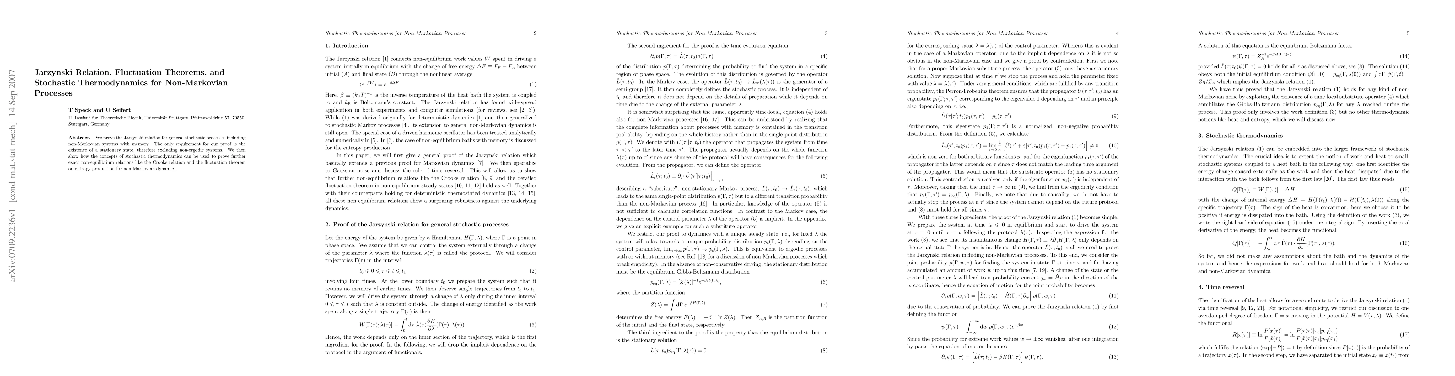 This paper proves the Jarzynski relation for non-Markovian stochastic processes, requiring only a stationary state, and extends stochastic thermodynamics to establish additional non-equilibrium relations such as the Crooks relation and entropy production fluctuation theorem for non-Markovian dynamics.