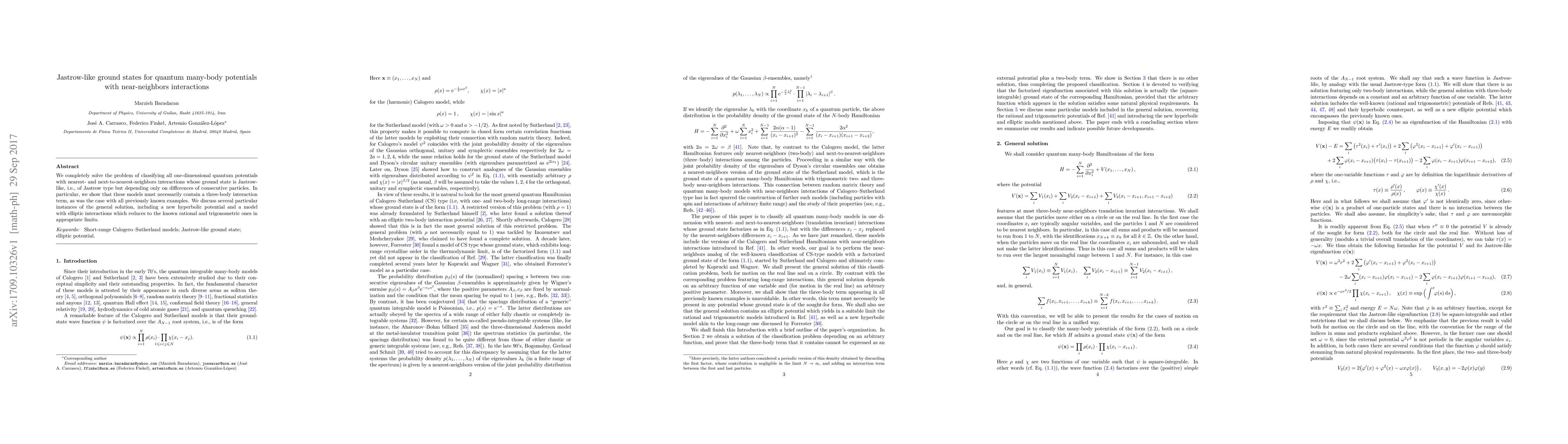 We completely solve the problem of classifying all one-dimensional quantum potentials with nearest- and next-to-nearest-neighbors interactions whose ground state is Jastrow-like, i.e., of Jastrow type but depending only on differences of consecutive particles. In particular, we show that these models must necessarily contain a three-body interaction term, as was the case with all previously known examples. We discuss several particular instances of the general solution, including a new hyperbolic potential and a model with elliptic interactions which reduces to the known rational and trigonometric ones in appropriate limits.