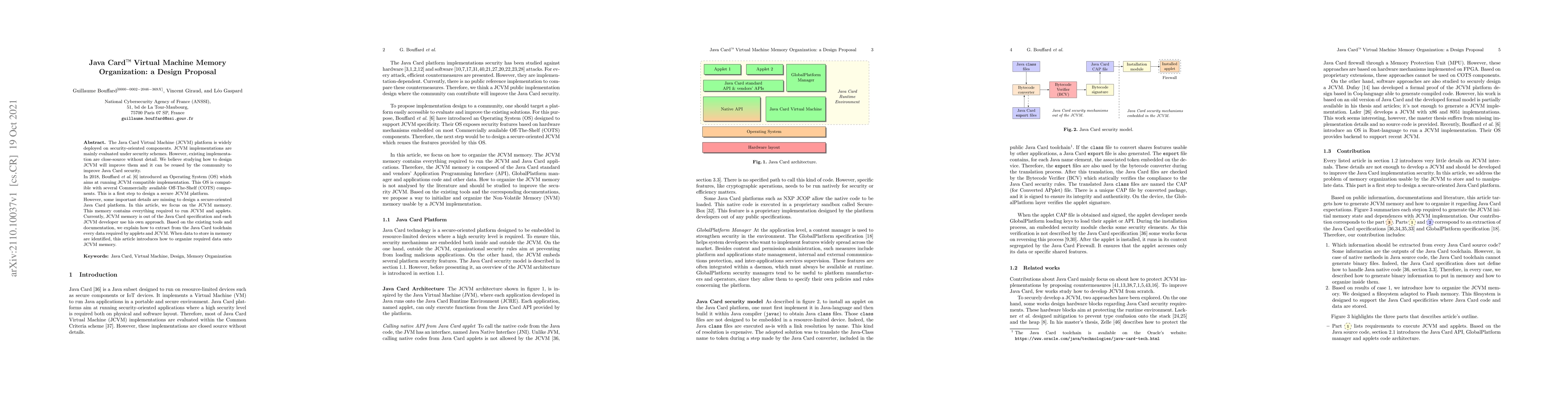 The Java Card Virtual Machine (JCVM) platform is widely deployed on security-oriented components. JCVM implementations are mainly evaluated under security schemes. However, existing implementation are close-source without detail. We believe studying how to design JCVM will improve them and it can be reused by the community to improve Java Card security. In 2018, Bouffard et al. [6] introduced an Operating System (OS) which aims at running JCVM compatible implementation. This OS is compatible with several Commercially available Off-The-Shelf (COTS) components. This is a first step to design a secure JCVM platform. However, some important details are missing to design a secure-oriented Java Card platform. In this article, we focus on the JCVM memory. This memory contains everything required to run JCVM and applets. Currently, JCVM memory is out of the Java Card specification and each JCVM developer use his own approach. Based on the existing tools and documentation, we explain how to extract from the Java Card toolchain every data required by applets and JCVM. When data to store in memory are identified, this article introduces how to organize required data onto JCVM memory.