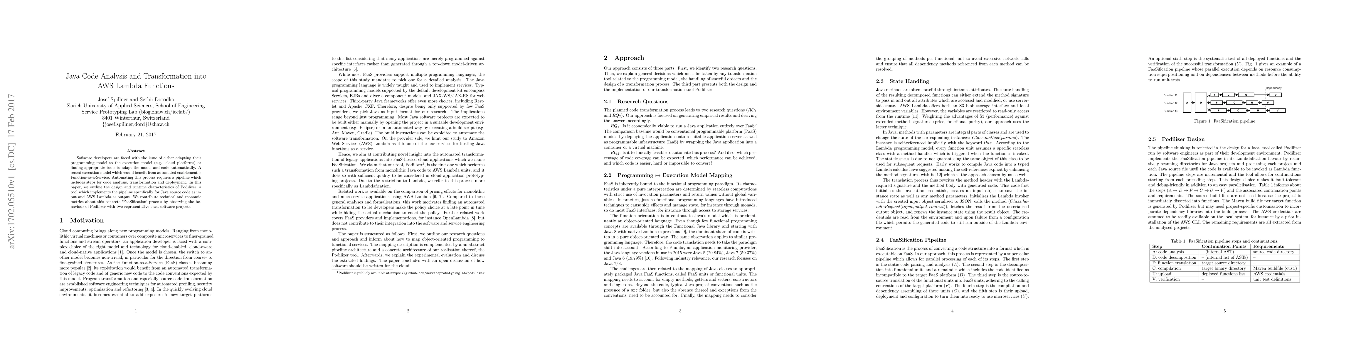 Software developers are faced with the issue of either adapting their programming model to the execution model (e.g. cloud platforms) or finding appropriate tools to adapt the model and code automatically. A recent execution model which would benefit from automated enablement is Function-as-a-Service. Automating this process requires a pipeline which includes steps for code analysis, transformation and deployment. In this paper, we outline the design and runtime characteristics of Podilizer, a tool which implements the pipeline specifically for Java source code as input and AWS Lambda as output. We contribute technical and economic metrics about this concrete 'FaaSification' process by observing the behaviour of Podilizer with two representative Java software projects.
