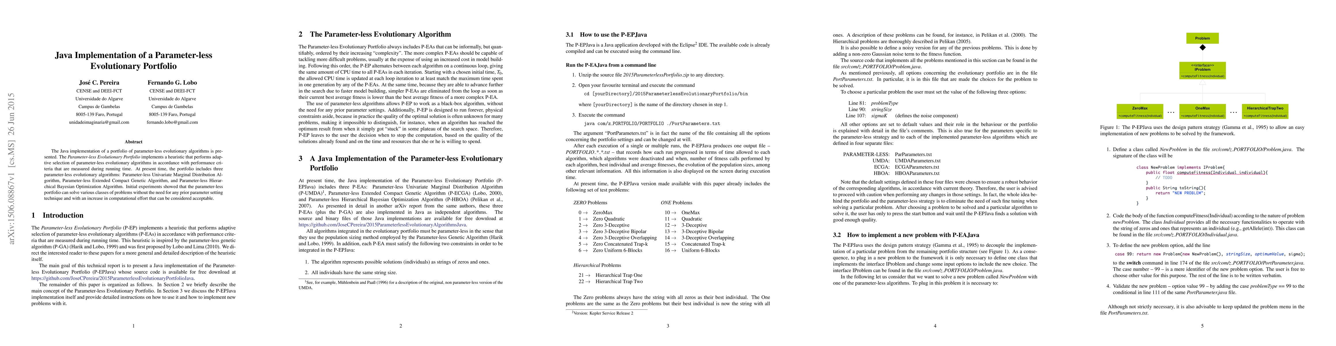 The main technical contribution is the Java implementation of the parameter-less evolutionary portfolio (P-EPJava) that integrates three parameter-less evolutionary algorithms using a strategy design pattern, enabling easy addition of new problems.