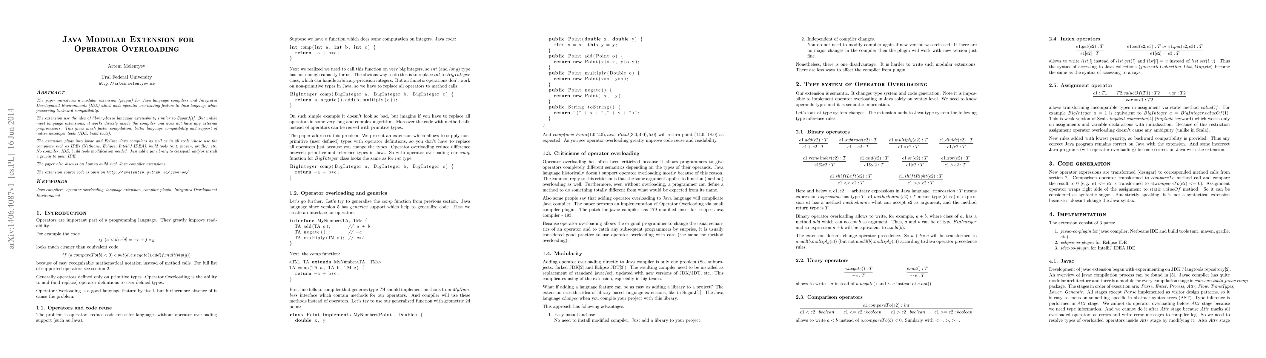 This paper presents a modular Java compiler plugin that introduces operator overloading to Java while maintaining backward compatibility. Unlike other extensions, it operates directly within the compiler without external preprocessors, ensuring faster compilation and better compatibility with native tools.