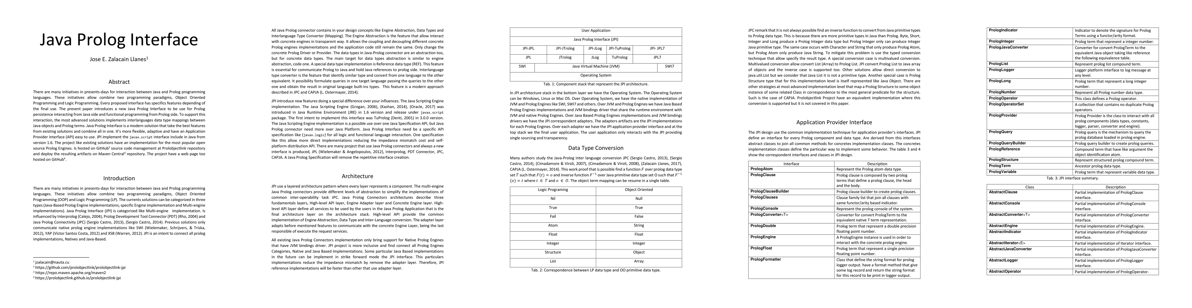 This paper introduces a new Java Prolog Interface (JPI) that facilitates interaction between Java and Prolog, combining object-oriented and logic programming paradigms. JPI offers an easy-to-use API for Prolog persistence from Java and functional programming from Prolog, leveraging advanced interlanguage data type mappings.