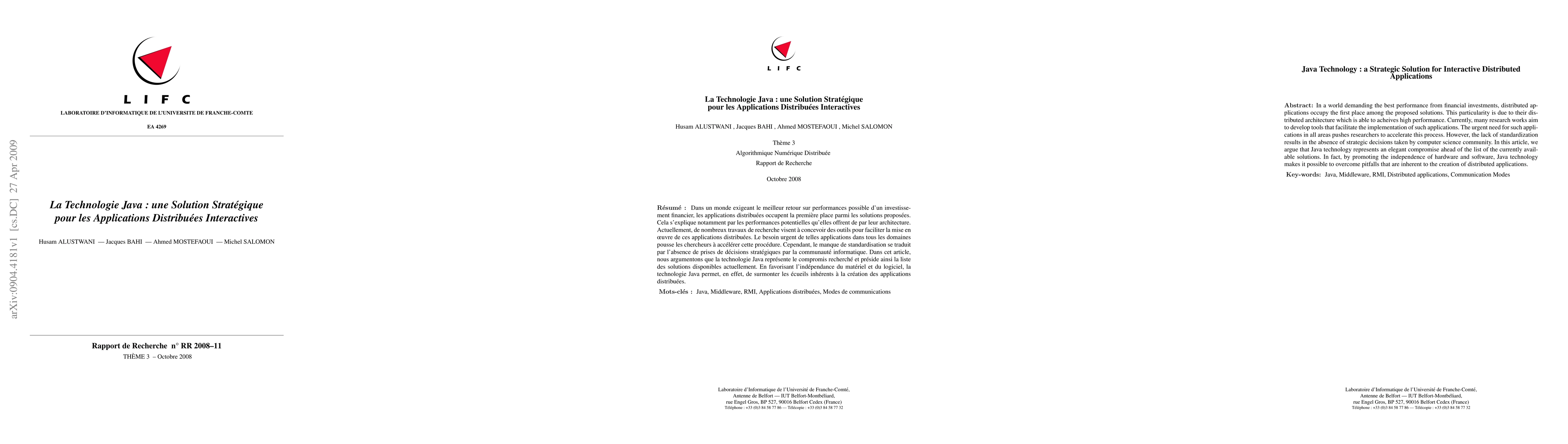 This paper argues that Java technology is a strategic solution for developing high-performance interactive distributed applications due to its ability to promote hardware and software independence, thereby overcoming common pitfalls in distributed application creation. The lack of standardization in current tools is addressed by highlighting Java's role in facilitating strategic decisions in the computer science community.