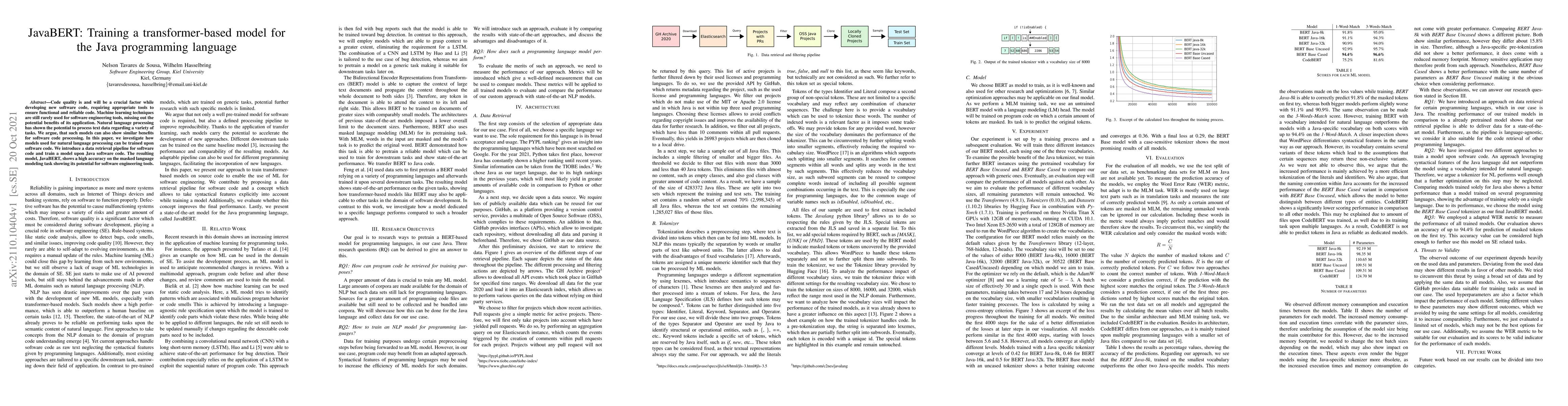 Code quality is and will be a crucial factor while developing new software code, requiring appropriate tools to ensure functional and reliable code. Machine learning techniques are still rarely used for software engineering tools, missing out the potential benefits of its application. Natural language processing has shown the potential to process text data regarding a variety of tasks. We argue, that such models can also show similar benefits for software code processing. In this paper, we investigate how models used for natural language processing can be trained upon software code. We introduce a data retrieval pipeline for software code and train a model upon Java software code. The resulting model, JavaBERT, shows a high accuracy on the masked language modeling task showing its potential for software engineering tools.