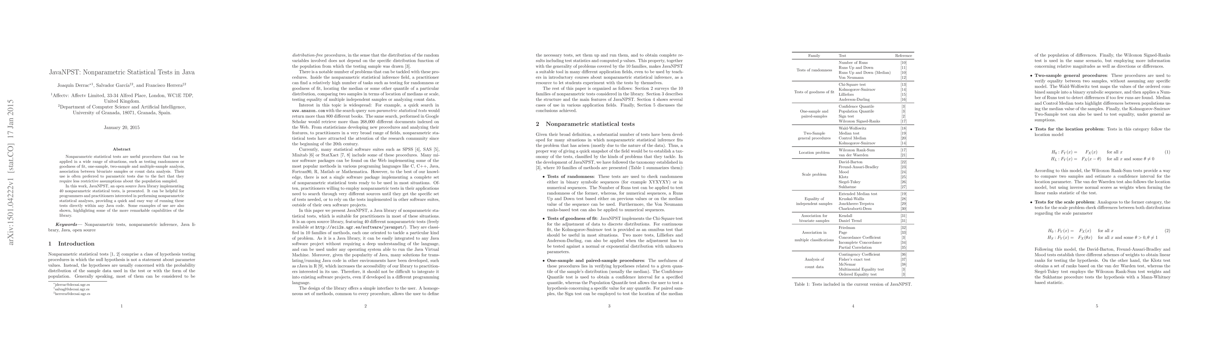 JavaNPST is an open-source Java library offering 40 nonparametric statistical tests for various analyses like testing randomness and association, reducing reliance on restrictive parametric assumptions. It aims to facilitate nonparametric statistical analyses for programmers and practitioners by integrating seamlessly into Java code.