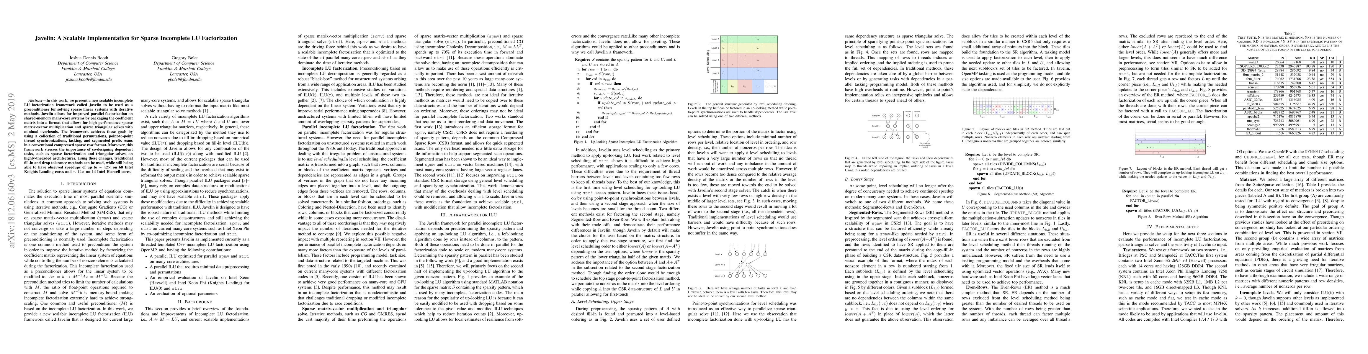 Javelin presents a scalable framework for sparse incomplete LU factorization, designed for use as a preconditioner in iterative solvers. It achieves significant parallel performance improvements on many-core systems through optimized matrix-vector operations and co-design of dependent tasks.