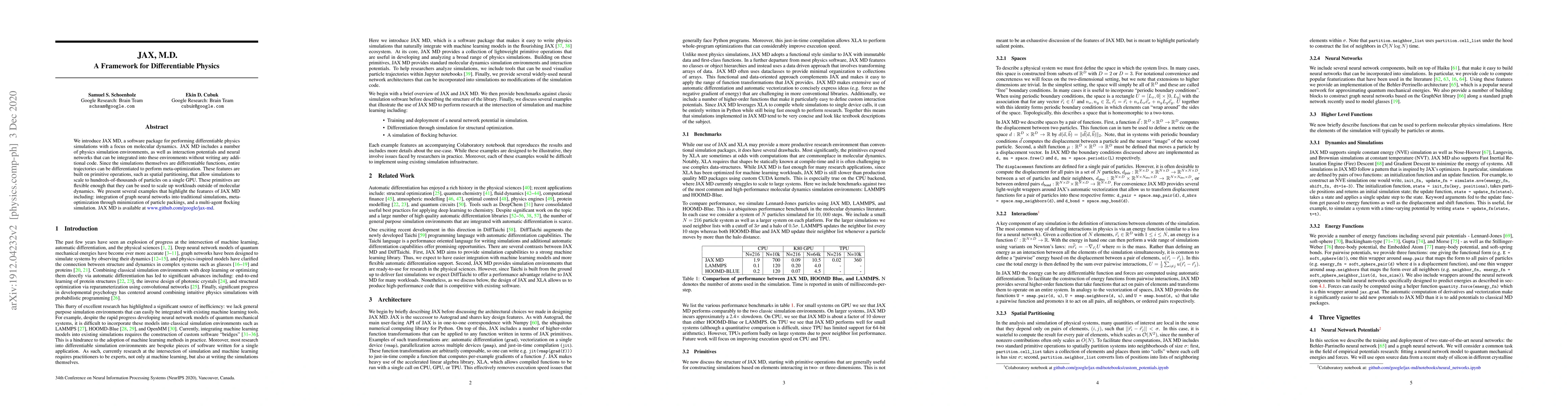 JAX MD is a software package for differentiable physics simulations, particularly in molecular dynamics, enabling meta-optimization through differentiable trajectories. It integrates neural networks and scales to large particle systems using flexible primitive operations.