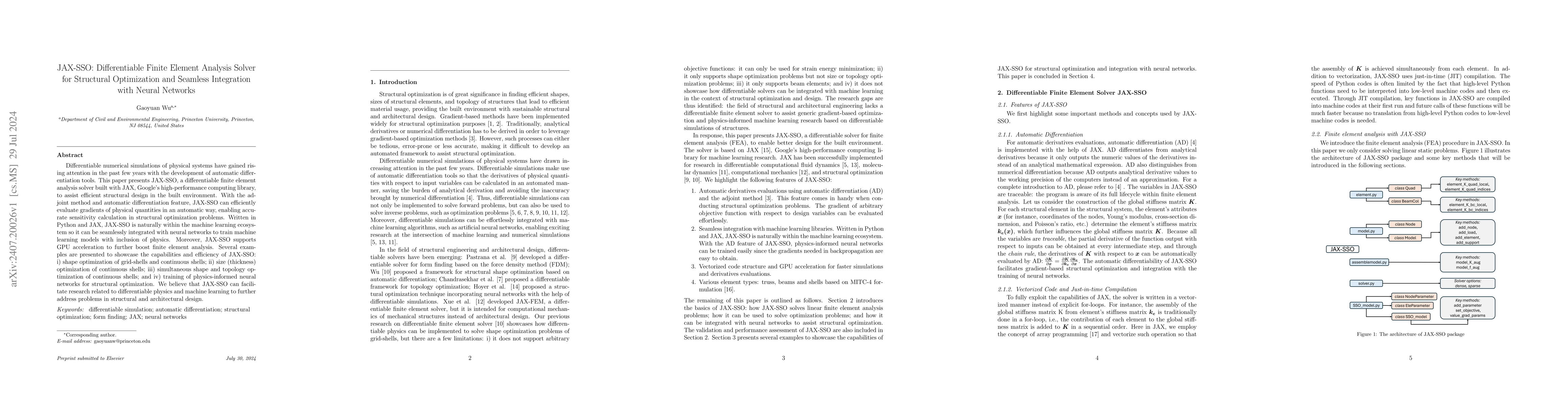 JAX-SSO is a differentiable finite element analysis solver for structural optimization, built with JAX and supporting GPU acceleration. It integrates seamlessly with neural networks, enabling accurate sensitivity calculations and facilitating physics-informed machine learning models.