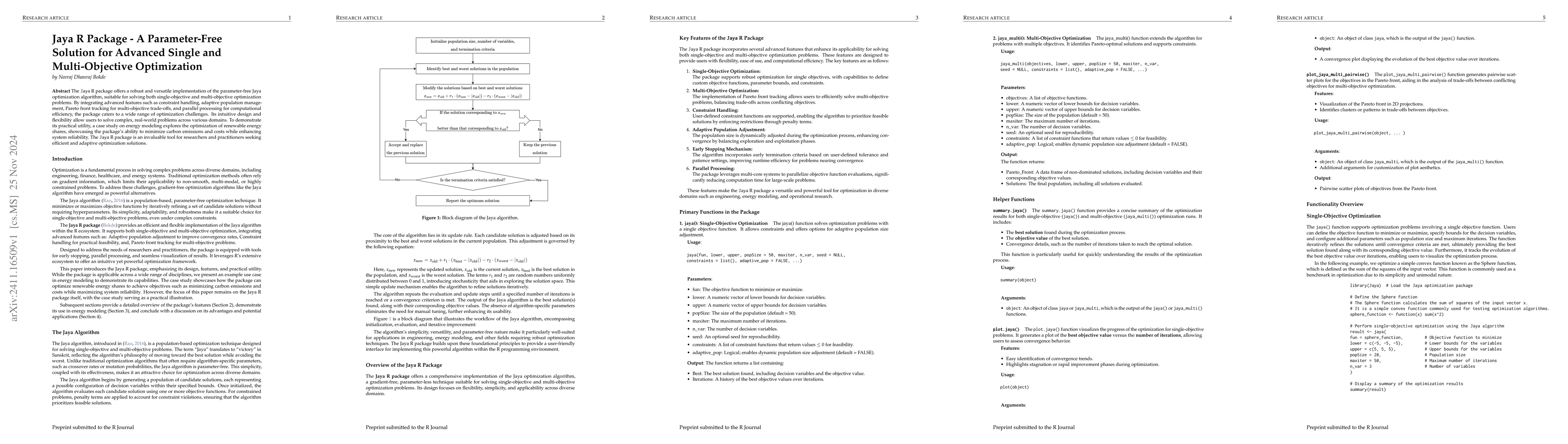 The Jaya R package implements a parameter-free Jaya optimization algorithm for both single and multi-objective problems, featuring constraint handling, adaptive population management, and parallel processing. Demonstrated through an energy modeling case study, it optimizes renewable energy shares to minimize emissions and costs while improving reliability.