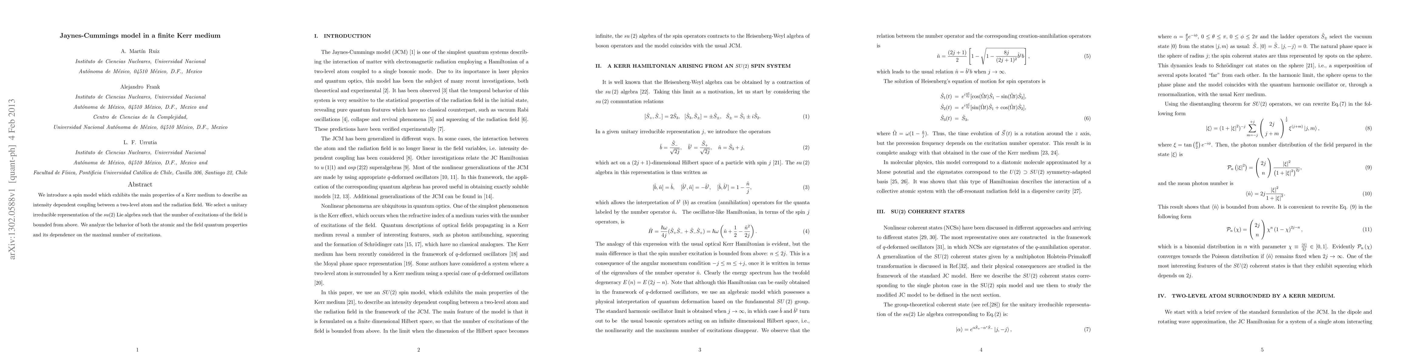 We introduce a spin model which exhibits the main properties of a Kerr medium to describe an intensity dependent coupling between a two-level atom and the radiation field. We select a unitary irreducible representation of the su(2) Lie algebra such that the number of excitations of the field is bounded from above. We analyze the behavior of both the atomic and the field quantum properties and its dependence on the maximal number of excitations.