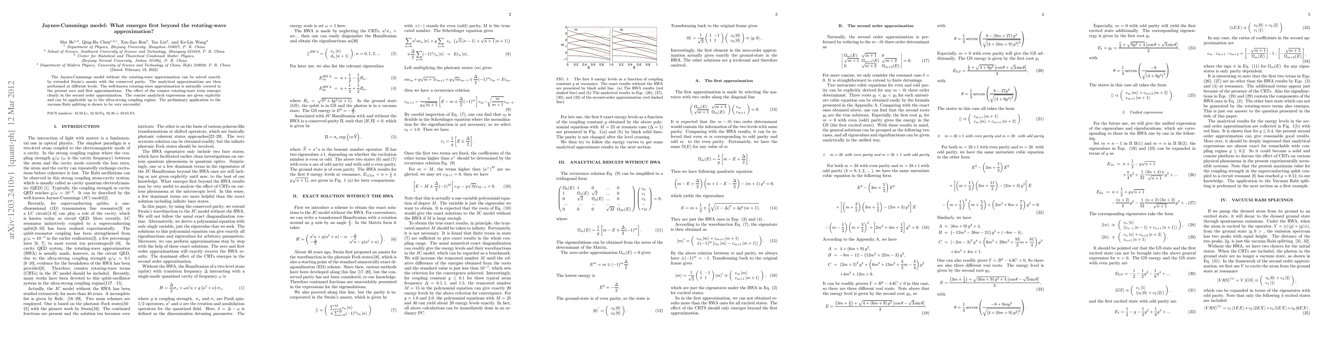 The Jaynes-Cummings model is exactly solvable beyond the rotating-wave approximation using extended Swain's ansatz, revealing the counter-rotating-wave term's effect in the second-order approximation, with successful preliminary application to vacuum Rabi splitting.