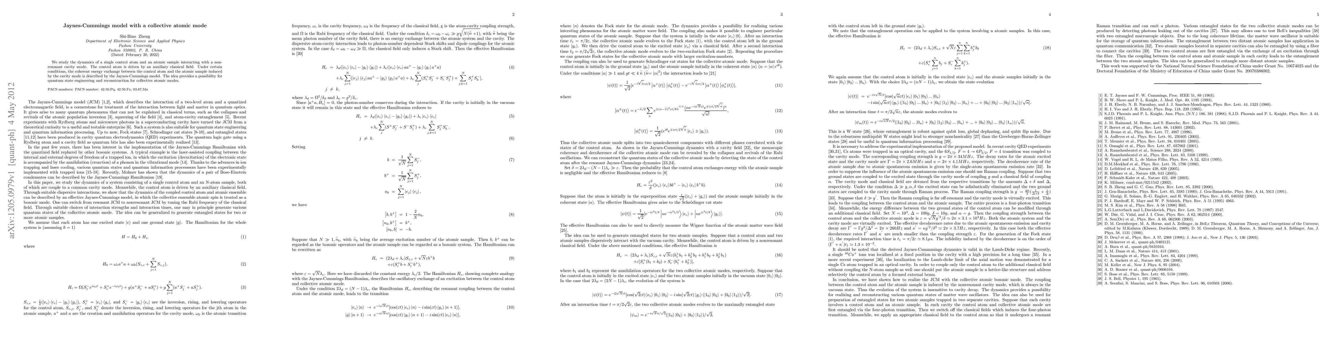 This paper investigates the dynamics of a single control atom and an atomic sample interacting with a nonresonant cavity mode, revealing coherent energy exchange described by the Jaynes-Cummings model, which enables quantum-state engineering and reconstruction for collective atomic modes.