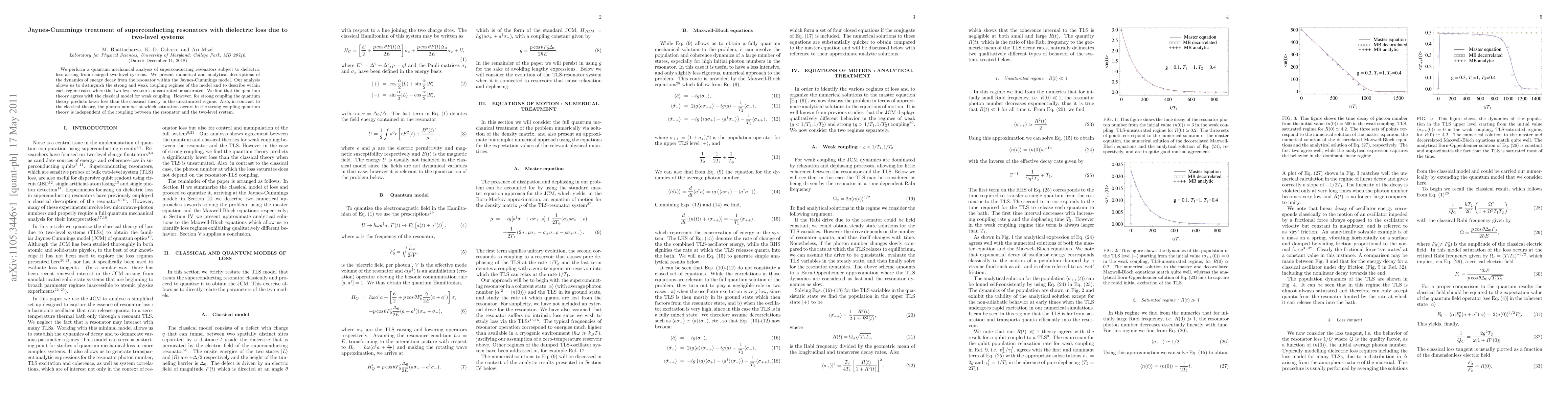 This paper analyzes superconducting resonators' dielectric loss due to two-level systems using the Jaynes-Cummings model, distinguishing strong and weak coupling regimes. It finds that quantum theory predicts lower loss in the unsaturated regime for strong coupling compared to classical models, and saturation photon number is coupling-independent in quantum theory.