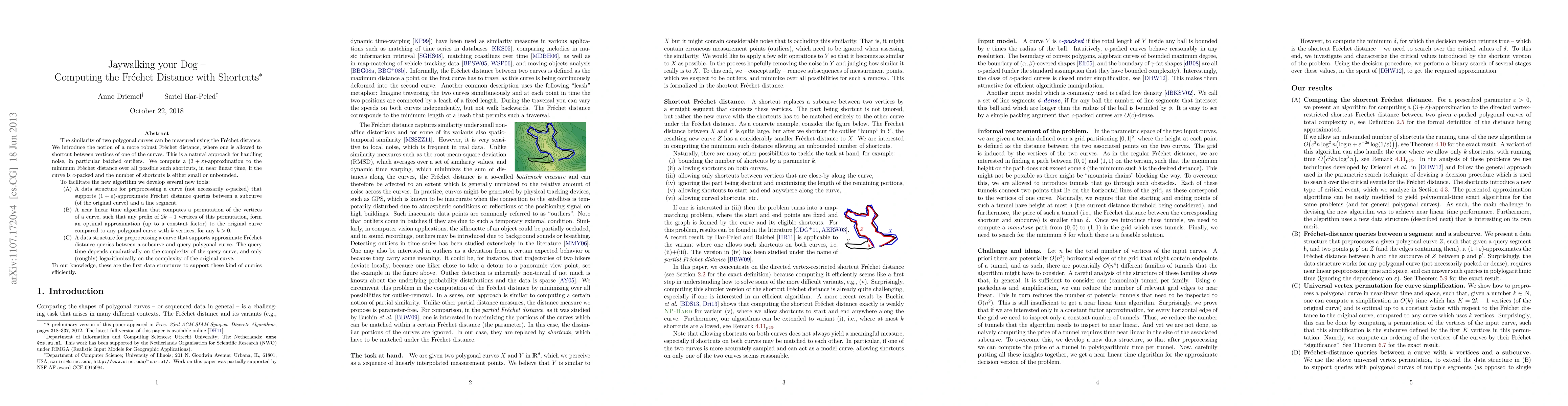 This paper introduces a robust version of the Fréchet distance allowing shortcuts between vertices to handle noise, and computes a near-linear time approximation. It develops new tools including a preprocessing data structure for approximate distance queries, an algorithm for optimal vertex permutation, and another for efficient approximate distance queries between subcurves and query polygonal curves.