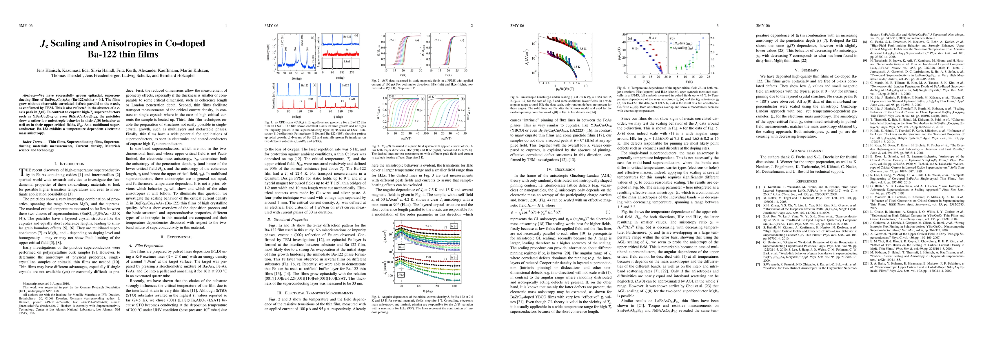 We have successfully grown epitaxial, superconducting films of Ba(Fe1-xCox)2As2 (Ba-122)with x ~ 0.1. The films grow without observable correlated defects parallel to the c-axis, as confirmed by TEM. This is also reflected in the absence of a caxis peak in Jc({\theta}). In contrast to cuprate high-Tc superconductors such as YBa2Cu3O7-d or even Bi2Sr2Ca2Cu3O10-d, the pnictides show a rather low anisotropic behavior in their Jc({\theta}) behavior as well as in their upper critical fields, Hc2. As a multiband superconductor, Ba-122 exhibits a temperature dependent electronic mass anisotropy.