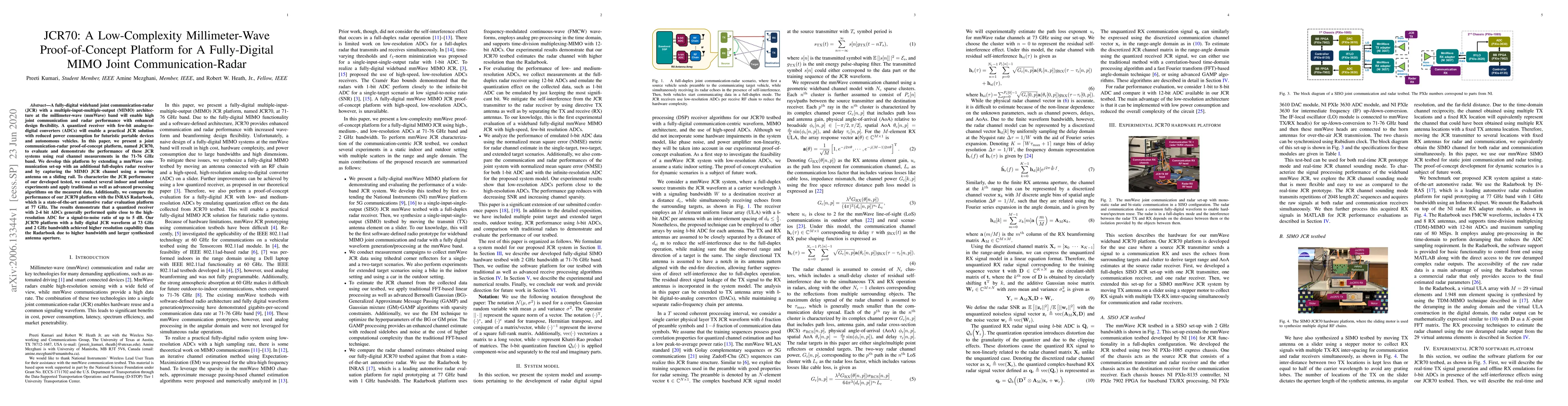 The paper introduces JCR70, a low-complexity millimeter-wave platform for evaluating fully-digital MIMO joint communication-radar systems. The platform demonstrates high performance with quantized receivers using few-bit ADCs, achieving results comparable to high-resolution ADCs for signal-to-noise ratios up to 5 dB, and surpassing a state-of-the-art automotive radar evaluation platform in resolution capability.