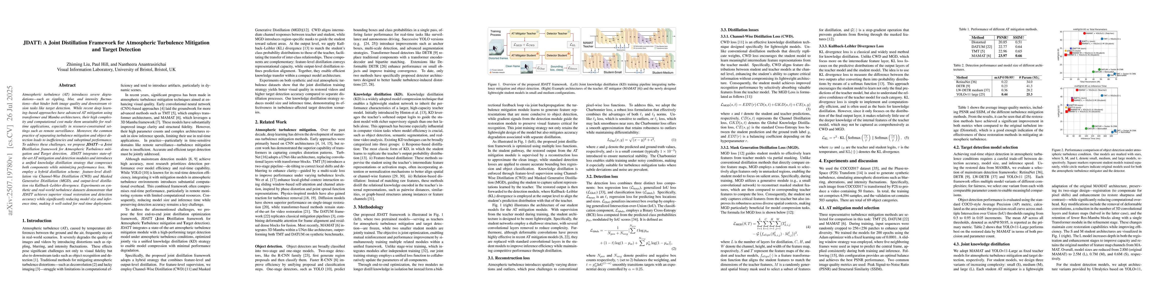 Atmospheric turbulence (AT) introduces severe degradations, such as rippling, blur, and intensity fluctuations, that hinder both image quality and downstream vision tasks like target detection. While recent deep learning-based approaches have advanced AT mitigation using transformer and Mamba architectures, their high complexity and computational cost make them unsuitable for real-time applications, especially in resource-constrained settings such as remote surveillance. Moreover, the common practice of separating turbulence mitigation and object detection leads to inefficiencies and suboptimal performance. To address these challenges, we propose JDATT, a Joint Distillation framework for Atmospheric Turbulence mitigation and Target detection. JDATT integrates state-of-the-art AT mitigation and detection modules and introduces a unified knowledge distillation strategy that compresses both components while minimizing performance loss. We employ a hybrid distillation scheme: feature-level distillation via Channel-Wise Distillation (CWD) and Masked Generative Distillation (MGD), and output-level distillation via Kullback-Leibler divergence. Experiments on synthetic and real-world turbulence datasets demonstrate that JDATT achieves superior visual restoration and detection accuracy while significantly reducing model size and inference time, making it well-suited for real-time deployment.