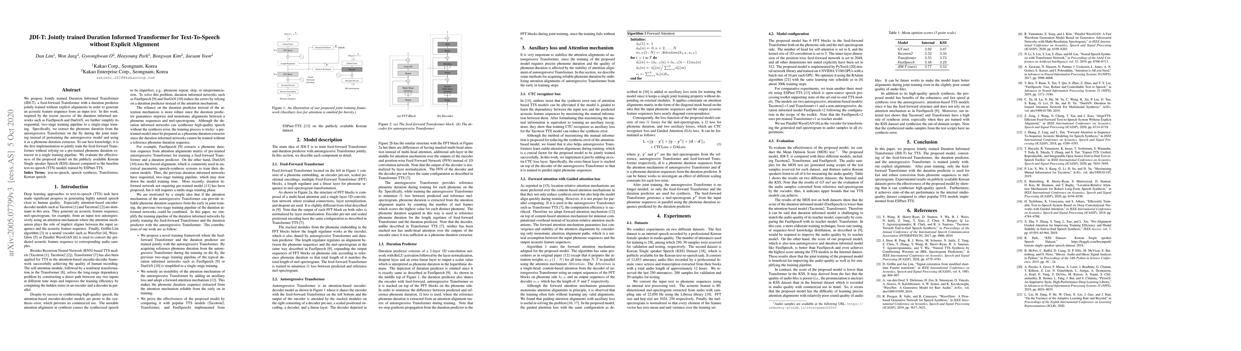 We propose Jointly trained Duration Informed Transformer (JDI-T), a feed-forward Transformer with a duration predictor jointly trained without explicit alignments in order to generate an acoustic feature sequence from an input text. In this work, inspired by the recent success of the duration informed networks such as FastSpeech and DurIAN, we further simplify its sequential, two-stage training pipeline to a single-stage training. Specifically, we extract the phoneme duration from the autoregressive Transformer on the fly during the joint training instead of pretraining the autoregressive model and using it as a phoneme duration extractor. To our best knowledge, it is the first implementation to jointly train the feed-forward Transformer without relying on a pre-trained phoneme duration extractor in a single training pipeline. We evaluate the effectiveness of the proposed model on the publicly available Korean Single speaker Speech (KSS) dataset compared to the baseline text-to-speech (TTS) models trained by ESPnet-TTS.