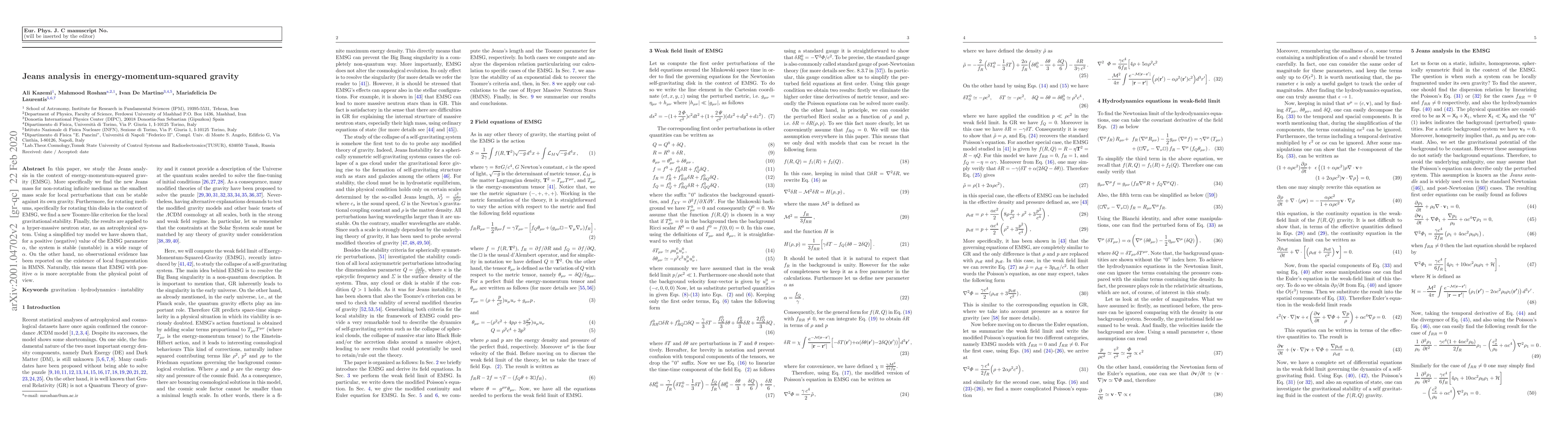 This paper explores Jeans analysis in energy-momentum-squared gravity (EMSG), determining the new Jeans mass for non-rotating infinite mediums and a Toomre-like criterion for rotating thin disks. It concludes that EMSG with positive parameters is more physically acceptable, as no local fragmentation has been observed in hyper-massive neutron stars.