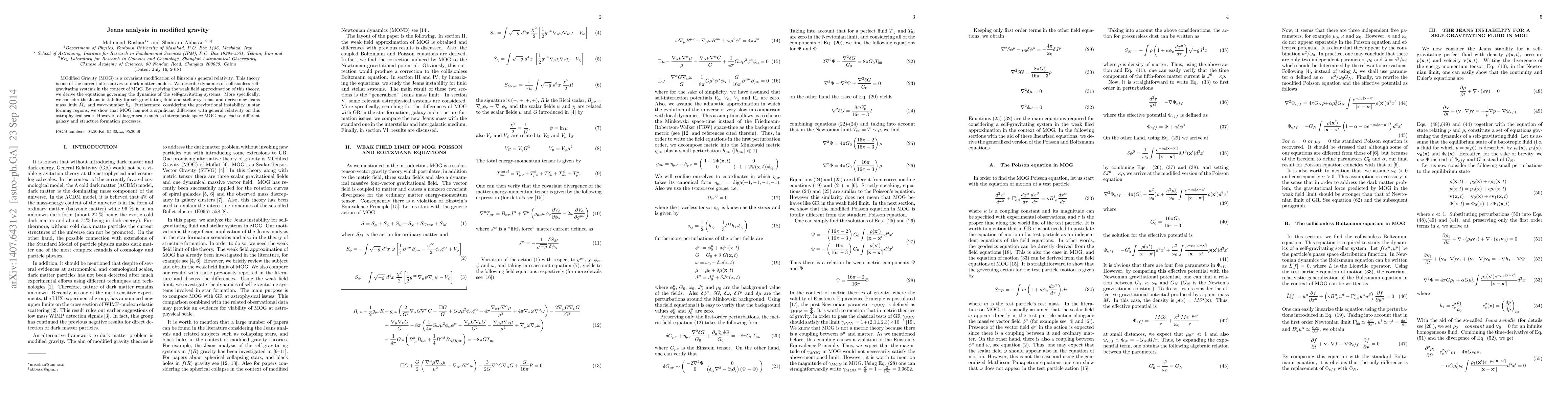 This paper explores the dynamics of collisionless self-gravitating systems within the framework of Modified Gravity (MOG), deriving new Jeans mass limit and wave-number. It finds MOG behaves similarly to general relativity on astrophysical scales but suggests potential differences in galaxy and structure formation at intergalactic scales.