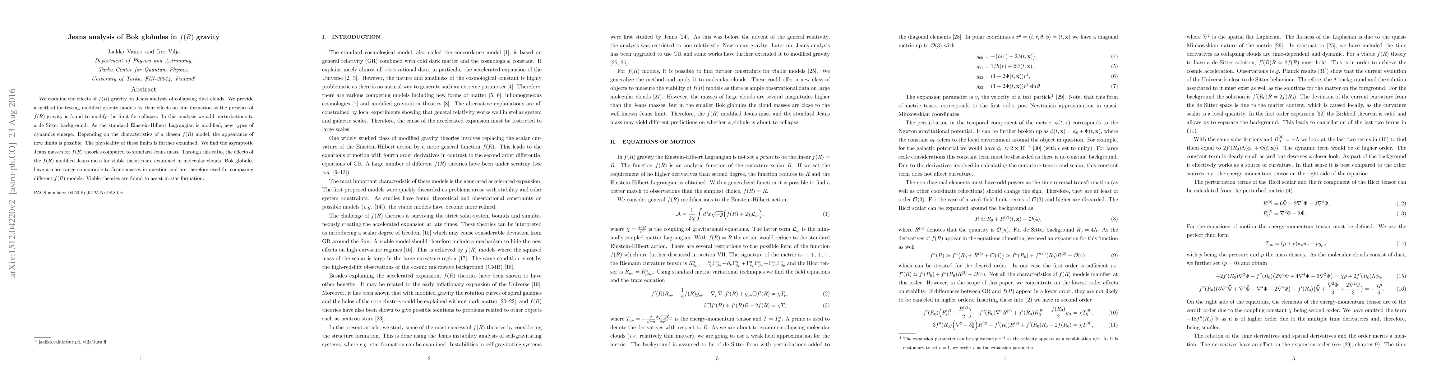 We examine the effects of $f(R)$ gravity on Jeans analysis of collapsing dust clouds. We provide a method for testing modified gravity models by their effects on star formation as the presence of $f(R)$ gravity is found to modify the limit for collapse. In this analysis we add perturbations to a de Sitter background. Depending on the characteristics of a chosen $f(R)$ model, the appearance of new limits is possible. The physicality of these limits is further examined. We find the asymptotic Jeans masses for $f(R)$ theories compared to standard Jeans mass. Through this ratio, the effects of the $f(R)$ modified Jeans mass for viable theories are examined in molecular clouds. Bok globules have a mass range comparable to Jeans masses in question and are therefore used for comparing different $f(R)$ models. Viable theories are found to assist in star formation.