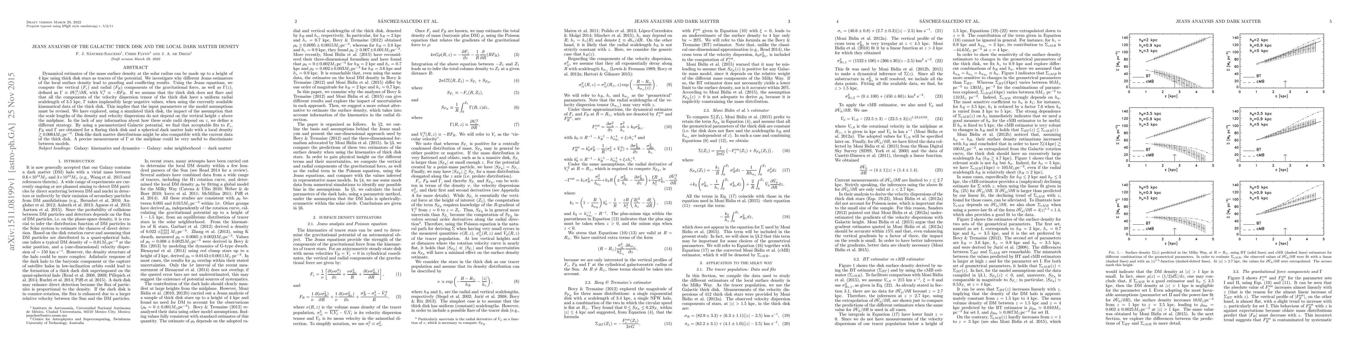 Dynamical estimates of the mass surface density at the solar radius can be made up to a height of 4 kpc using thick disk stars as tracers of the potential. We investigate why different Jeans estimators of the local surface density lead to puzzling and conflicting results. Using the Jeans equations, we compute the vertical (F_z) and radial (F_R) components of the gravitational force, as well as Gamma(z), defined as the radial derivative of V_c^2, with V_c^{2}= -RF_R. If we assume that the thick disk does not flare and that all the components of the velocity dispersion tensor of the thick disk have a uniform radial scalelength of 3.5 kpc, Gamma takes implausibly large negative values, when using the currently available kinematical data of the thick disk. This implies that the input parameters or the model assumptions must be revised. We have explored, using a simulated thick disk, the impact of the assumption that the scale lengths of the density and velocity dispersions do not depend on the vertical height z above the midplane. In the lack of any information about how these scale radii depend on z, we define a different strategy. By using a parameterized Galactic potential, we find that acceptable fits to F_z, F_R and Gamma are obtained for a flaring thick disk and a spherical dark matter halo with a local density larger than 0.0064 M_sun pc^{-3}. Disk-like dark matter distributions might be also compatible with the current data of the thick disk. A precise measurement of Gamma at the midplane could be very useful to discriminate between models.