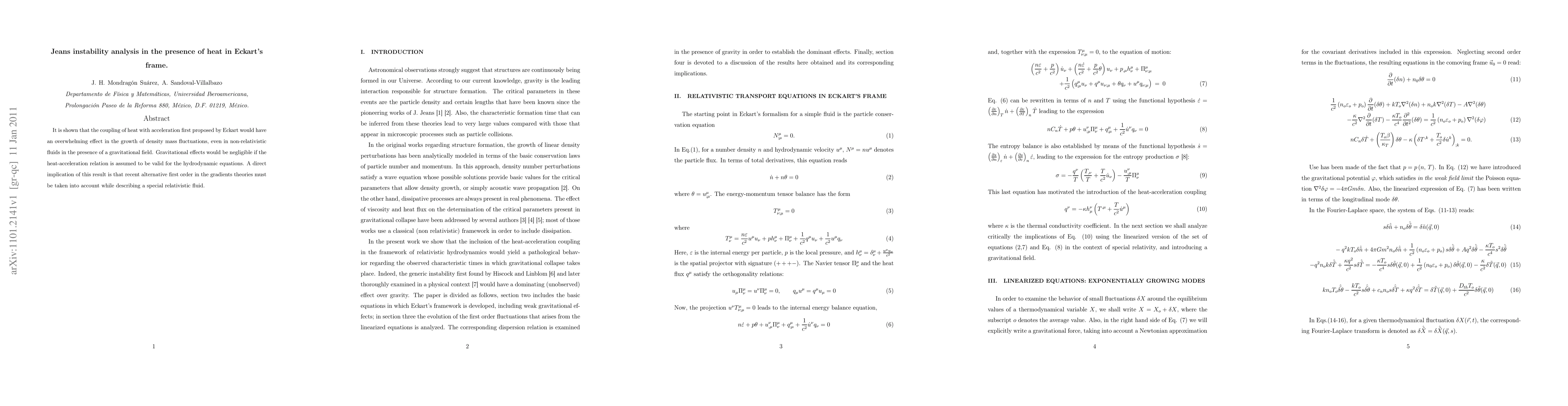 It is shown that the coupling of heat with acceleration first proposed by Eckart would have an overwhelming effect in the growth of density mass fluctuations, even in non-relativistic fluids in the presence of a gravitational field. Gravitational effects would be negligible if the heat-acceleration relation is assumed to be valid for the hydrodynamic equations. A direct implication of this result is that recent alternative first order in the gradients theories must be taken into account while describing a special relativistic fluid.