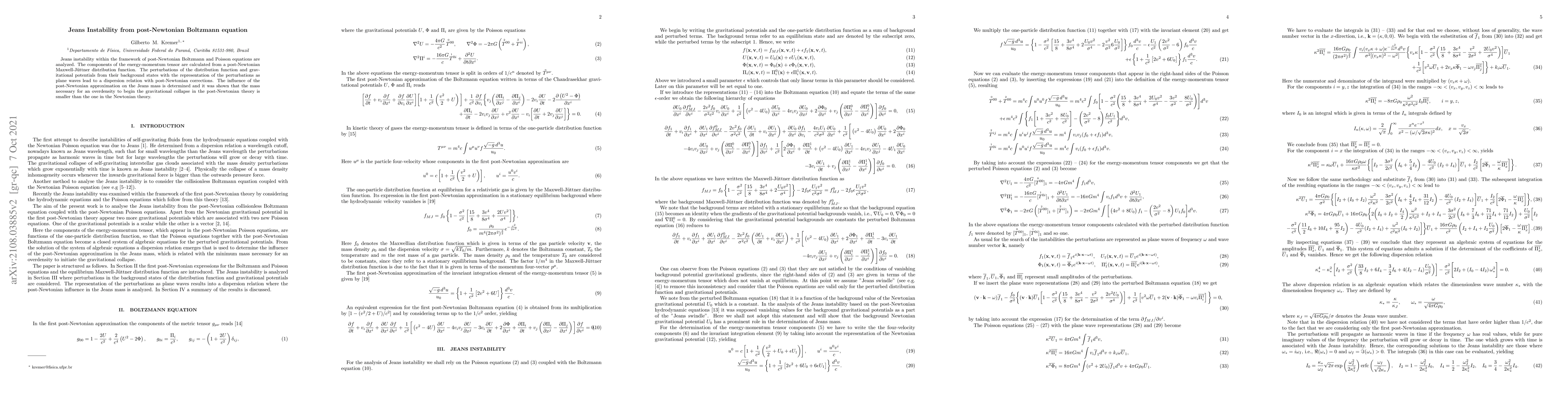 This paper analyzes Jeans instability using the post-Newtonian Boltzmann and Poisson equations, deriving a dispersion relation with post-Newtonian corrections. It finds that the Jeans mass, the mass needed for gravitational collapse, is smaller in the post-Newtonian theory compared to Newtonian theory.