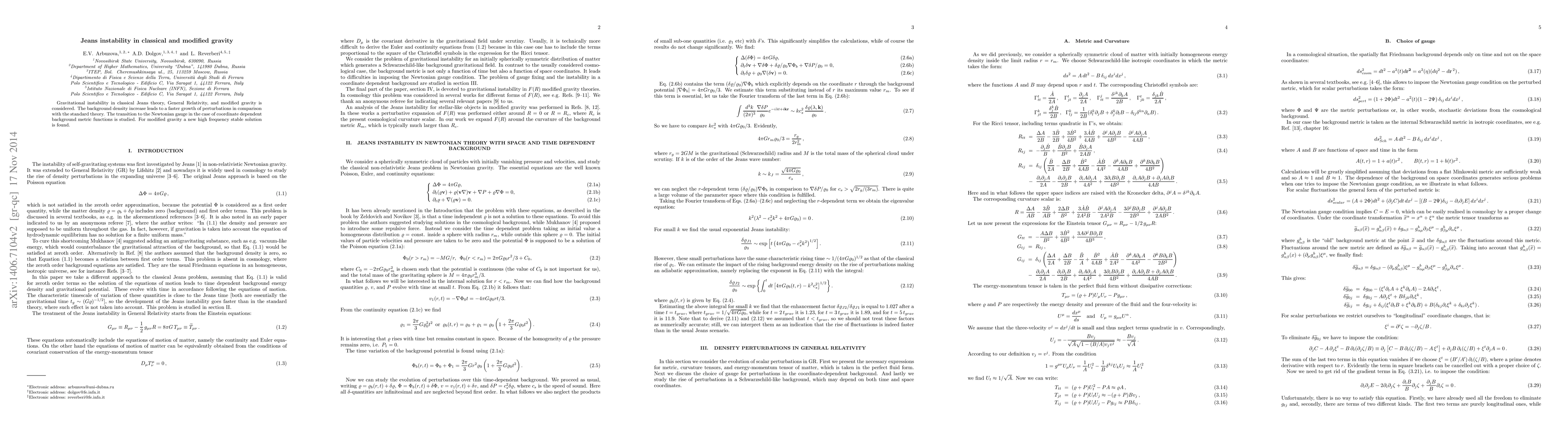 This paper explores gravitational instability in classical Jeans theory, General Relativity, and modified gravity, finding that increased background density accelerates perturbation growth. It also investigates the transition to the Newtonian gauge and discovers a new high-frequency stable solution for modified gravity.
