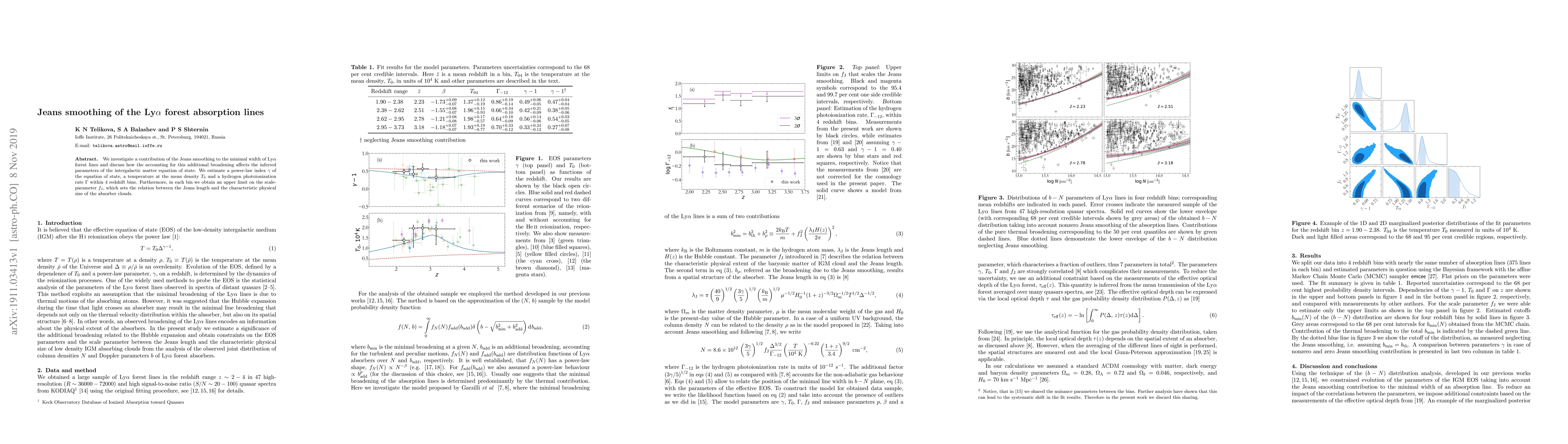 We investigate a contribution of the Jeans smoothing to the minimal width of Ly$\alpha$ forest lines and discuss how the accounting for this additional broadening affects the inferred parameters of the intergalactic matter equation of state. We estimate a power-law index $\gamma$ of the equation of state, a temperature at the mean density $T_0$ and a hydrogen photoionization rate $\Gamma$ within 4 redshift bins. Furthermore, in each bin we obtain an upper limit on the scale-parameter $f_{\rm J}$, which sets the relation between the Jeans length and the characteristic physical size of the absorber clouds.