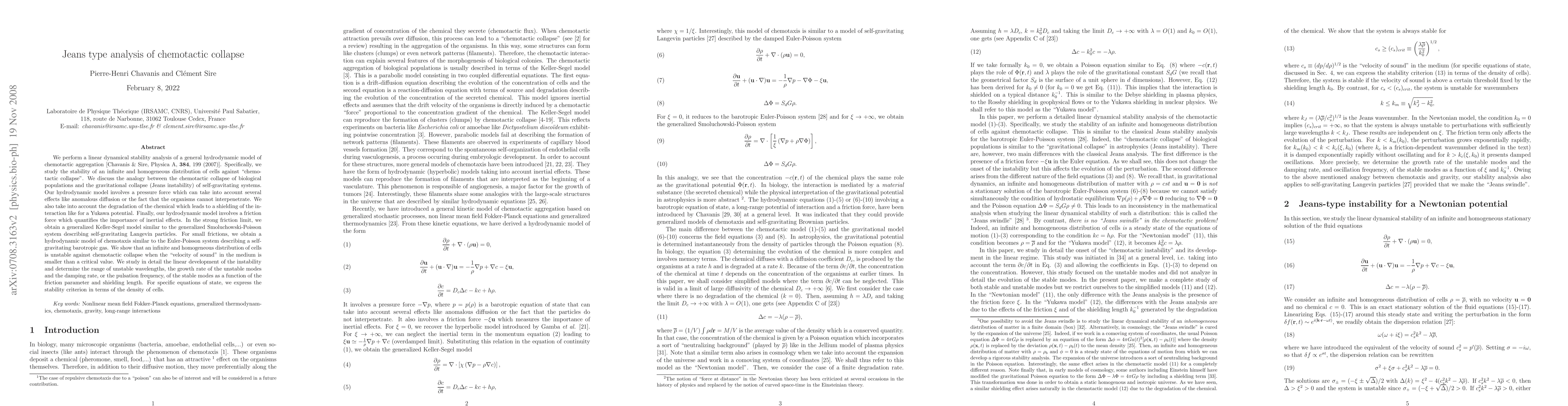 This paper conducts a linear dynamical stability analysis of a hydrodynamic model of chemotactic aggregation, revealing that an infinite homogeneous cell distribution is unstable against chemotactic collapse when the medium's "velocity of sound" is below a critical value. The study draws parallels between chemotactic collapse and gravitational collapse, examining the effects of friction, shielding, and anomalous diffusion on the instability.