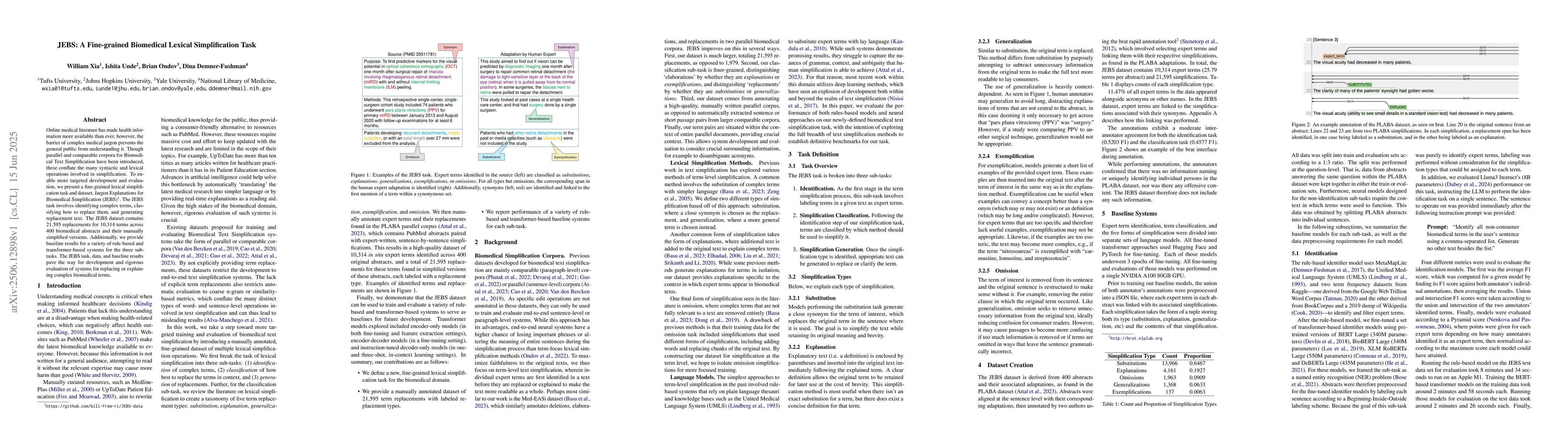The research introduces JEBS, a fine-grained biomedical lexical simplification task and dataset to bridge the gap between complex medical jargon and public understanding. It consists of 21,595 replacements for 10,314 terms across 400 abstracts, along with baseline results for various rule-based and transformer-based systems.