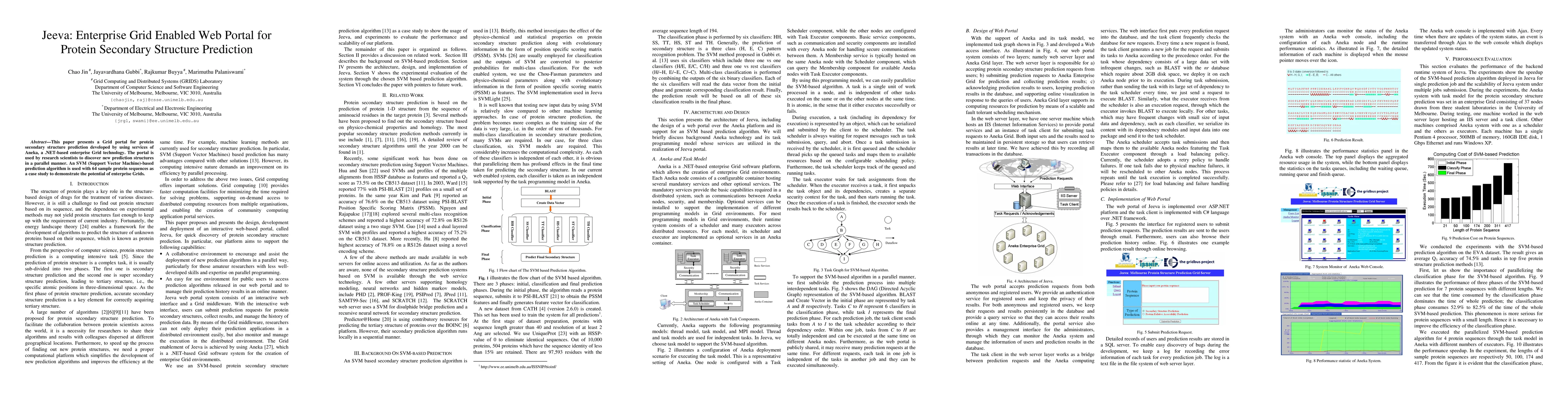 The paper presents Jeeva, a Grid portal for protein secondary structure prediction using Aneka, a .NET-based enterprise Grid technology. It employs an SVM-based prediction algorithm with 64 sample protein sequences as a case study.